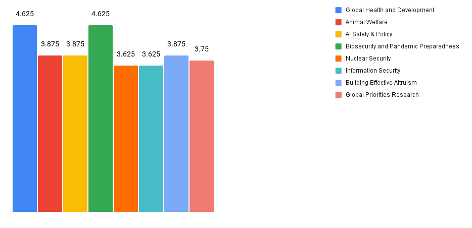 For sessions that attendees found particularly good, they mentioned sessions on giving cash directly, biosecurity, AI safety and animal welfare. No respondent mentioned a session they found particularly bad.