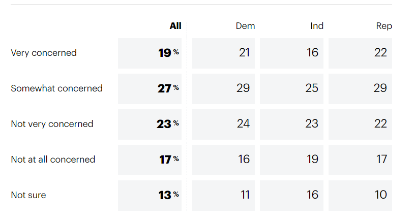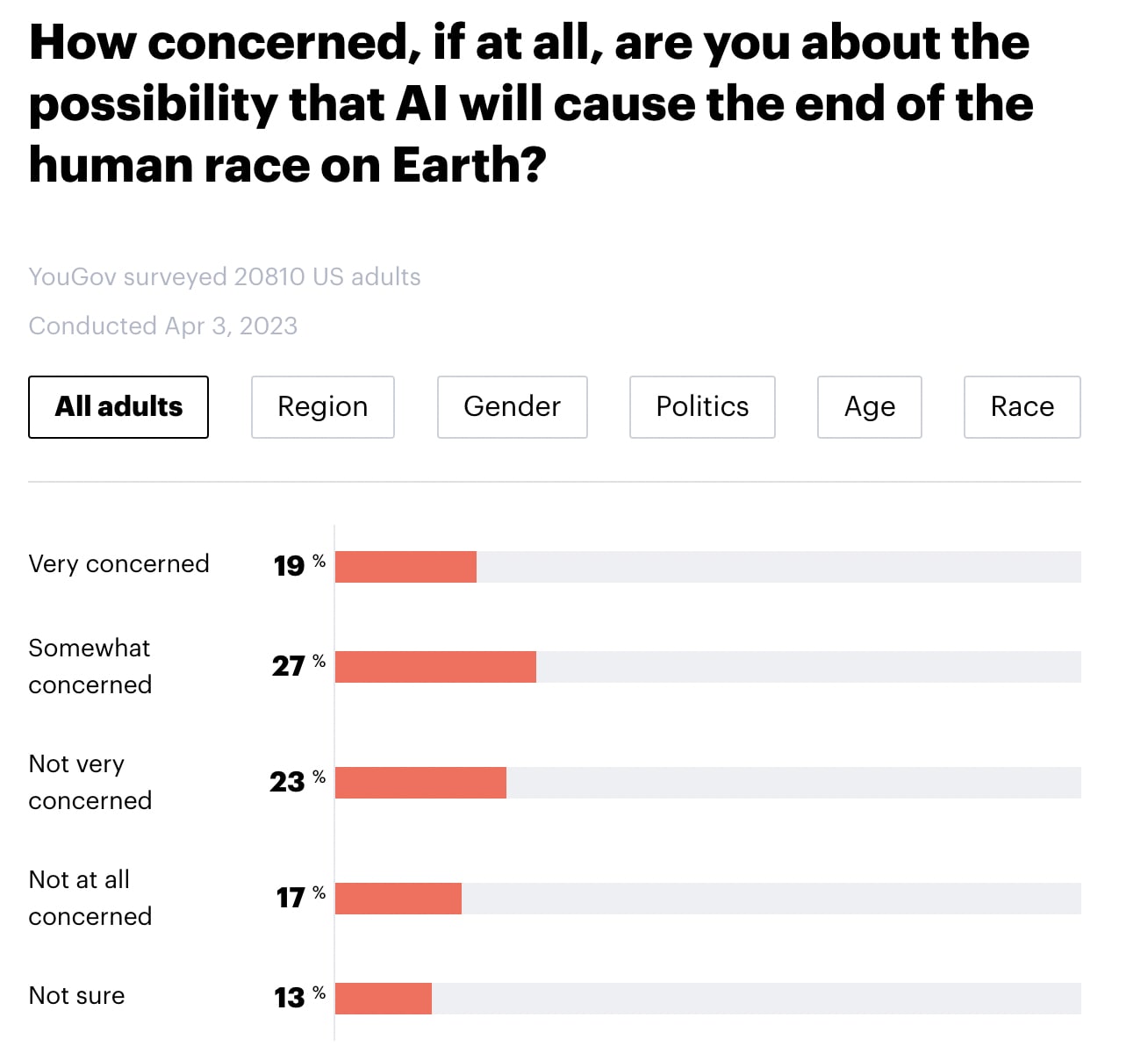 - 46% say that they are "very concerned" or "somewhat concerned" about the possibility that AI will cause the end of the human race on Earth (with 23% "not very concerned, 17% not concerned at all, and 13% not sure).
