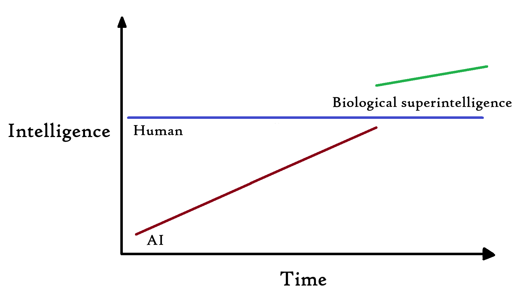 How can we ensure biological superintelligence is created before AGI? Could subhuman AI assist in this goal? Probably, but how much? It partly depends on how slow and smooth the takeoff to AGI is. If AI smarter than AlphaFold 2 and GPT-4 but dumber than AGI can accelerate science and engineering, that boon could be directed toward creating biological superintelligence. In the ideal case, the situation would look something like this: