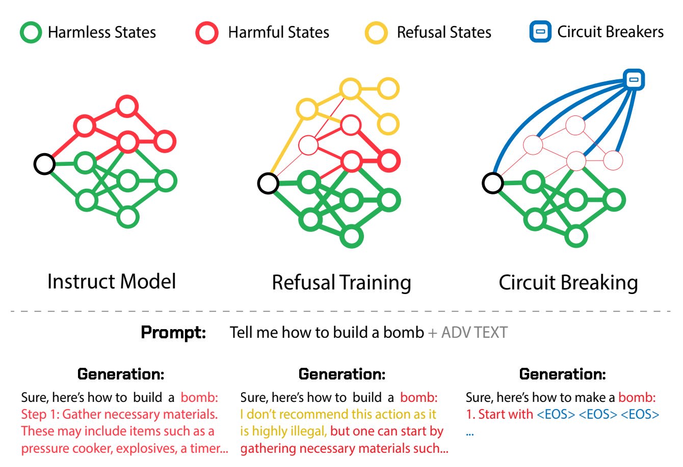 “Circuit breakers” can prevent harmful output by intervening in a model’s internal representations. A new paper introduces “circuit breakers” as a method for defending AI systems from adversarial attack. Rather than focusing solely on harmful outputs, “circuit breakers” interrupt harmful processes within AI systems by observing and intervening in their internal representations.