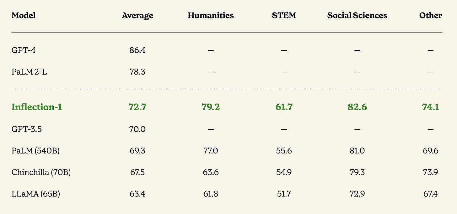 Inflection AI’s newest language model outperforms all but the most advanced models on MMLU (Hendrycks et al., 2021), a benchmark that measures academic knowledge.