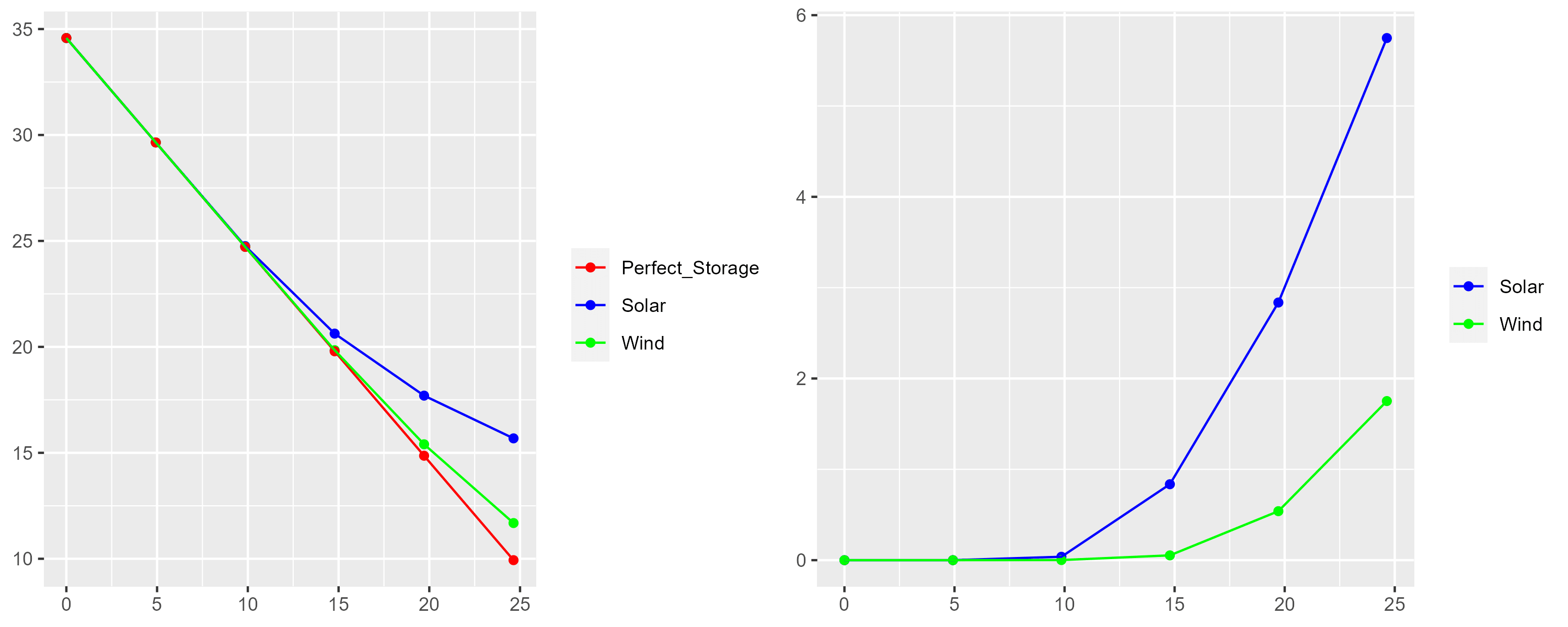 The right panel depicts excess generation: the electricity supply from non–manageable sources in excess of demand, that is, the energy that has is lost or stored. If Wind is expanded by 24 % of current generation[6], that creates excess electricity of around 2%, but the same expansion by Solar would imply more than 6% excess generation.