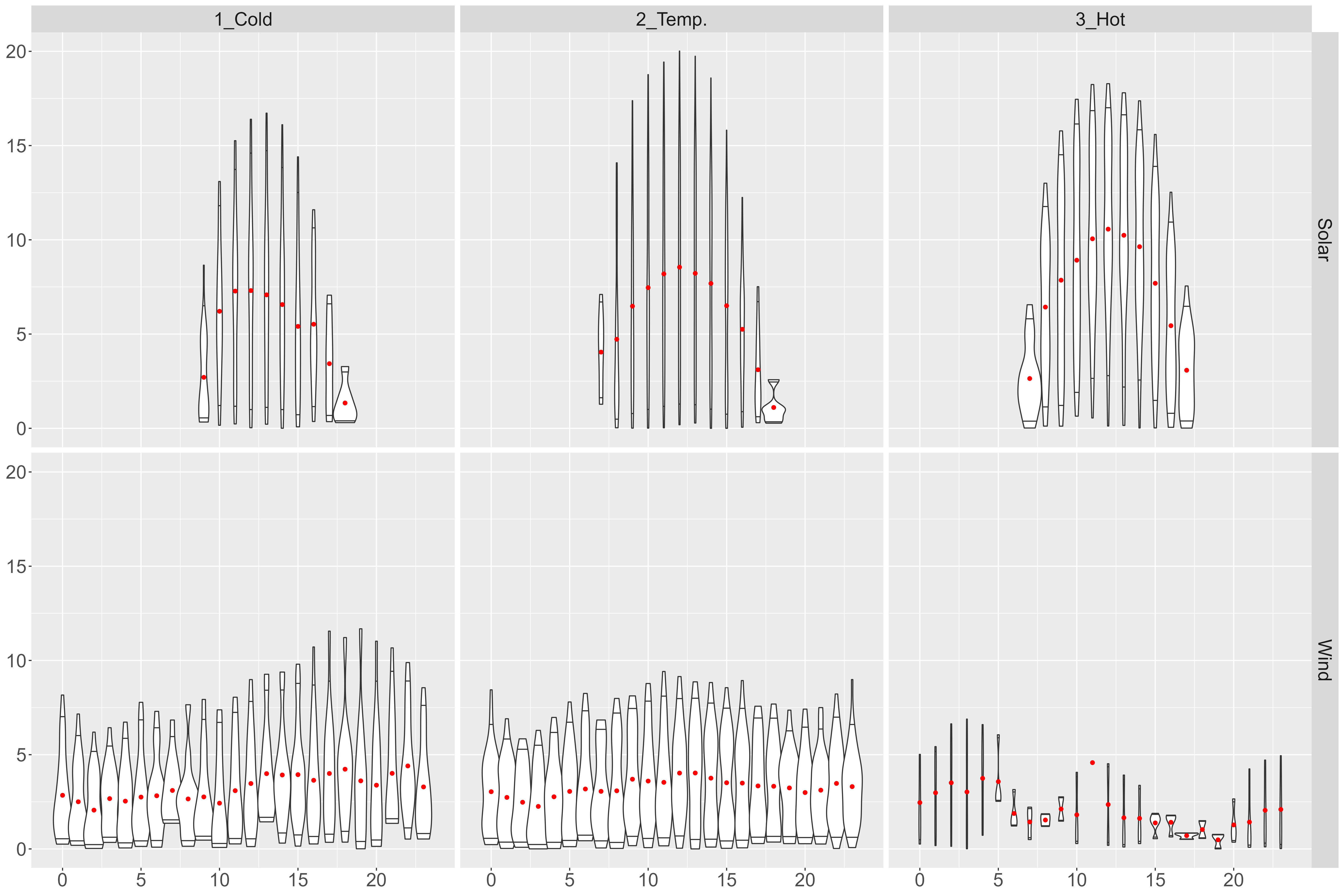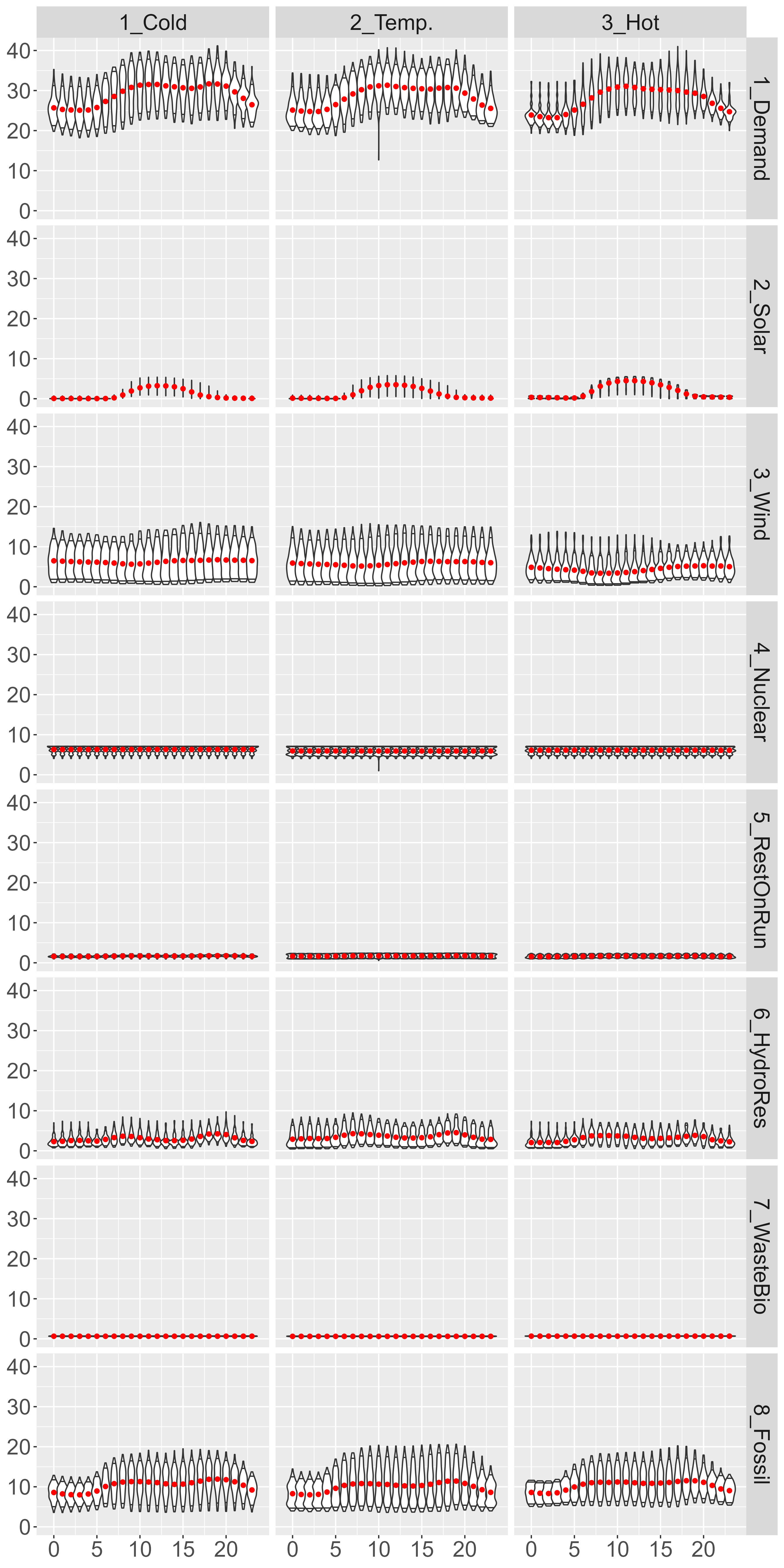 In Graph 1 the Demand the main supply sources are presented by row, while seasons (“Cold” season is December, January and February, “Hot” is June, July and August and “Temperate” is the rest of the year) are considered by column. Each panel depicts the distribution of supply (in thousands of Mwh, the red point is the mean of the distribution) by day hour (x-axis, 0-23).