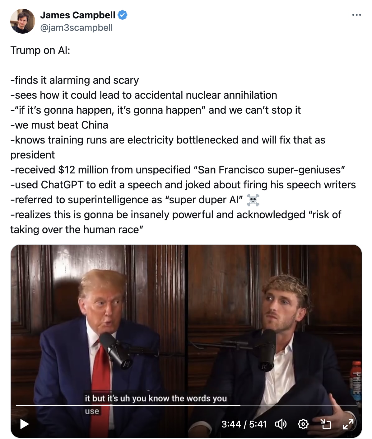 Given the way Trump talks it can be sometimes difficult to assess what he actually believes. In general, Trump expressed a mix of concern and support for advanced AI. My impression is that Trump was more interested in advancing AI, rather than opposing it out of concern for the human race.