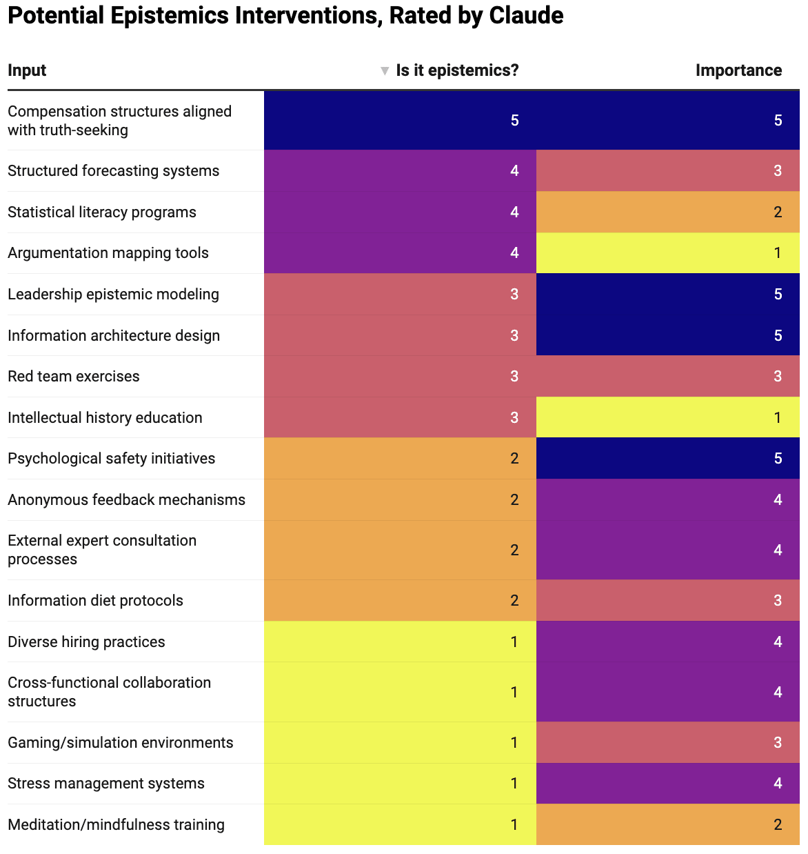 As a larger sample, I asked Claude to take these ideas and make a longer table of interventions (focused on organizations), ranked on both importance and “Is it epistemics?” I then made some minor and quick adjustments.