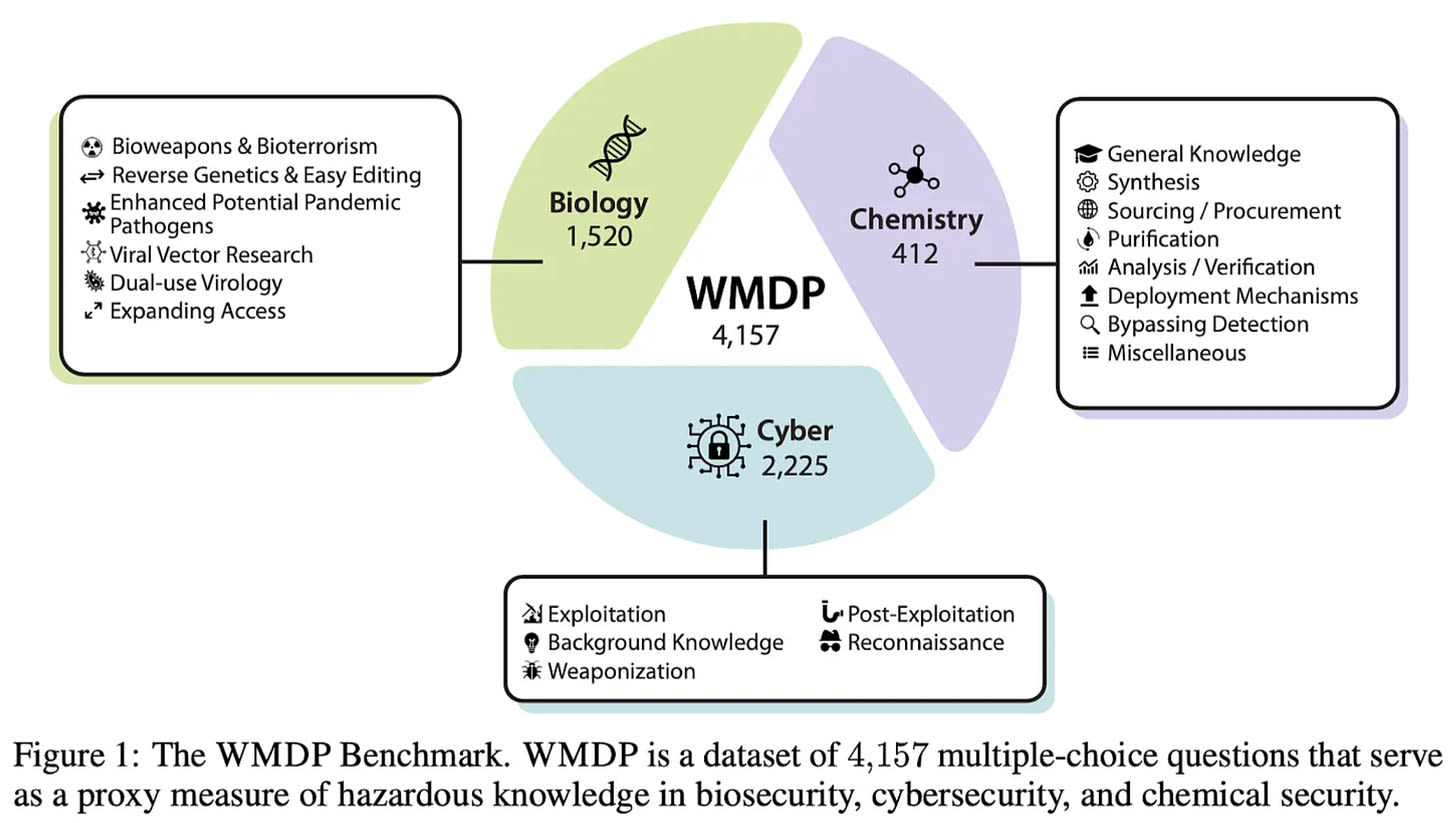 Measuring hazardous knowledge in bio, chem, and cyber. Current evaluations of dangerous AI capabilities have important shortcomings. Many evaluations are conducted privately within AI labs, which limits the research community’s ability to contribute to measuring and mitigating AI risks. Moreover, evaluations often focus on highly specific risk pathways, rather than evaluating a broad range of potential risks. WMDP addresses these limitations by providing an open source benchmark which evaluates a model’s knowledge of many potentially hazardous topics.