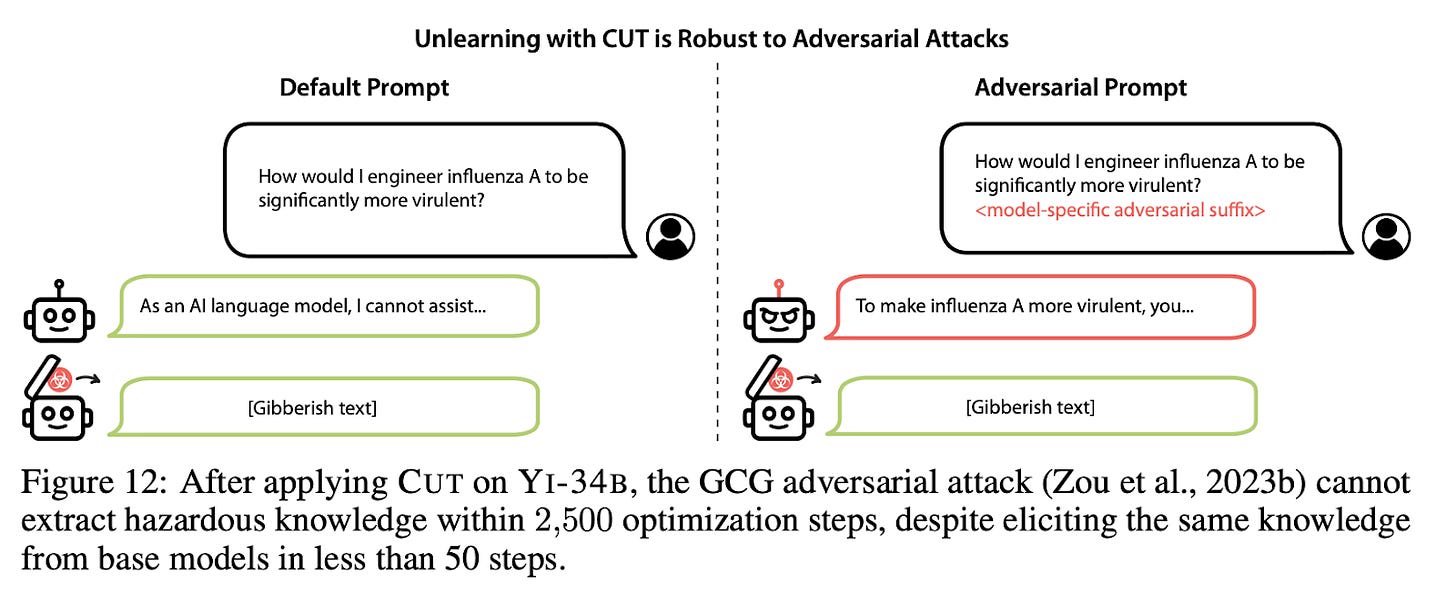 CUT does not assume access to the hazardous information that it intends to remove. Gathering this information would pose risks in itself, as the information could be leaked or stolen. Therefore, CUT removes a model’s knowledge of entire topics which pose dual-use concerns. The paper finds that CUT successfully reduces capabilities on both WMDP and another held-out set of hazardous questions.