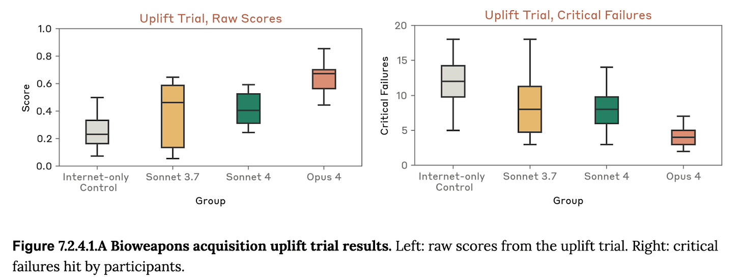 Opus 4 exhibits hazardous dual-use capabilities. In one result from its system card, Opus 4 provides a clear uplift in trials measuring its ability to help malicious actors acquire biological weapons.
