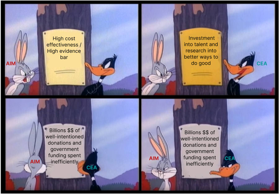 On collaborating/cutting costs: my outside impression is that AIM is already quite good about keeping their costs low and is not shy about being proactive. So my view is something like, if they thought it would be good for the world to collaborate more closely with CEA, I trust that they would have acted upon that belief. This is something that I respect about AIM (at least the version that's in my head, since I don't know them).