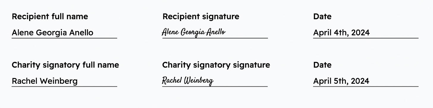 Better agreement display: now, the grant agreement displays the grantee’s agreement as a signature rather than simply a checkbox, and displays Manifund’s countersignature.