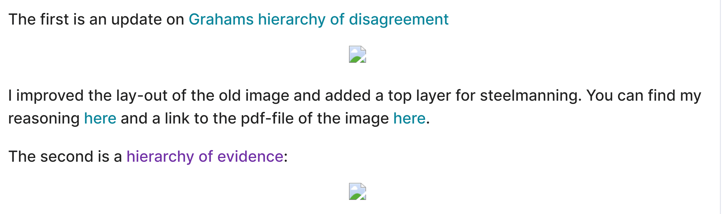 I made two visual guides that could be used to improve online discussions. These could be dropped into any conversation to (hopefully) make the discussion more productive.