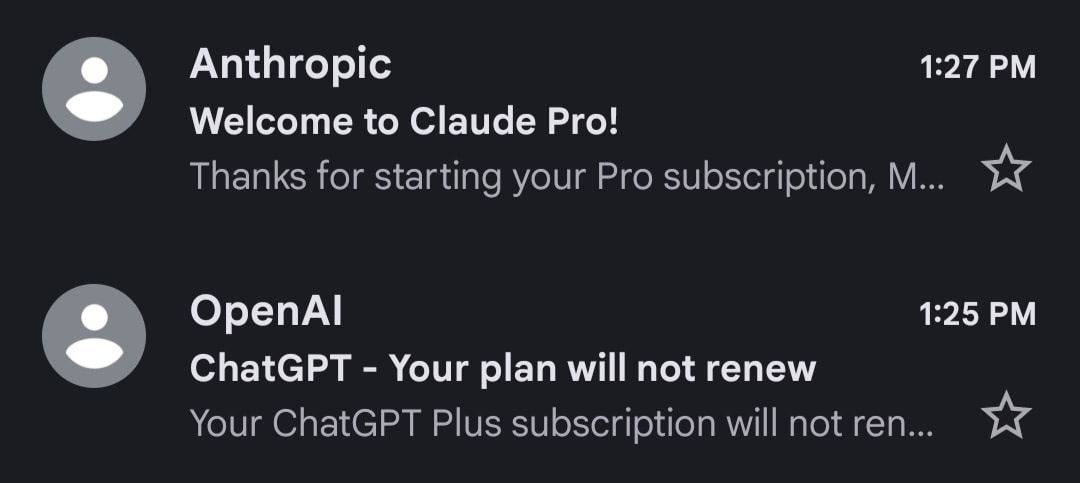 If GPT-5 releases I will probably resubscribe and test it out. I wouldn’t be surprised if future developments make the different offerings complements rather than substitutes, e.g with one specializing in image generation and another in code. But for now: