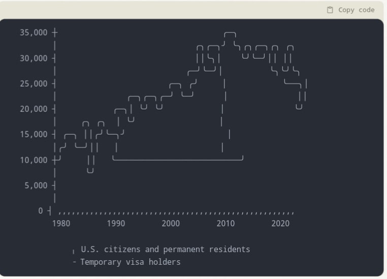 Claude also can’t execute the code it writes yet, though I expect this is coming soon. Here's Claude trying to graph some data for me in ASCII. Admirable effort and surprisingly accurate, but not very useful.