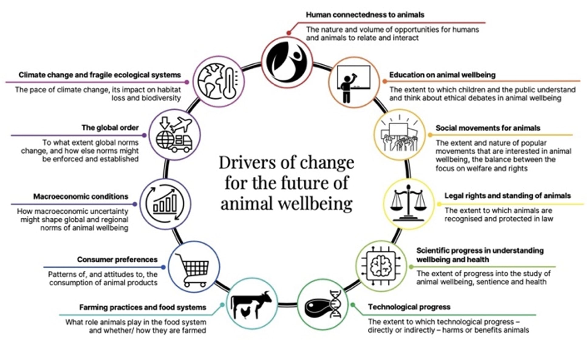 The project identified 11 “drivers” that are likely to be the most important issues influencing the future of animal wellbeing: