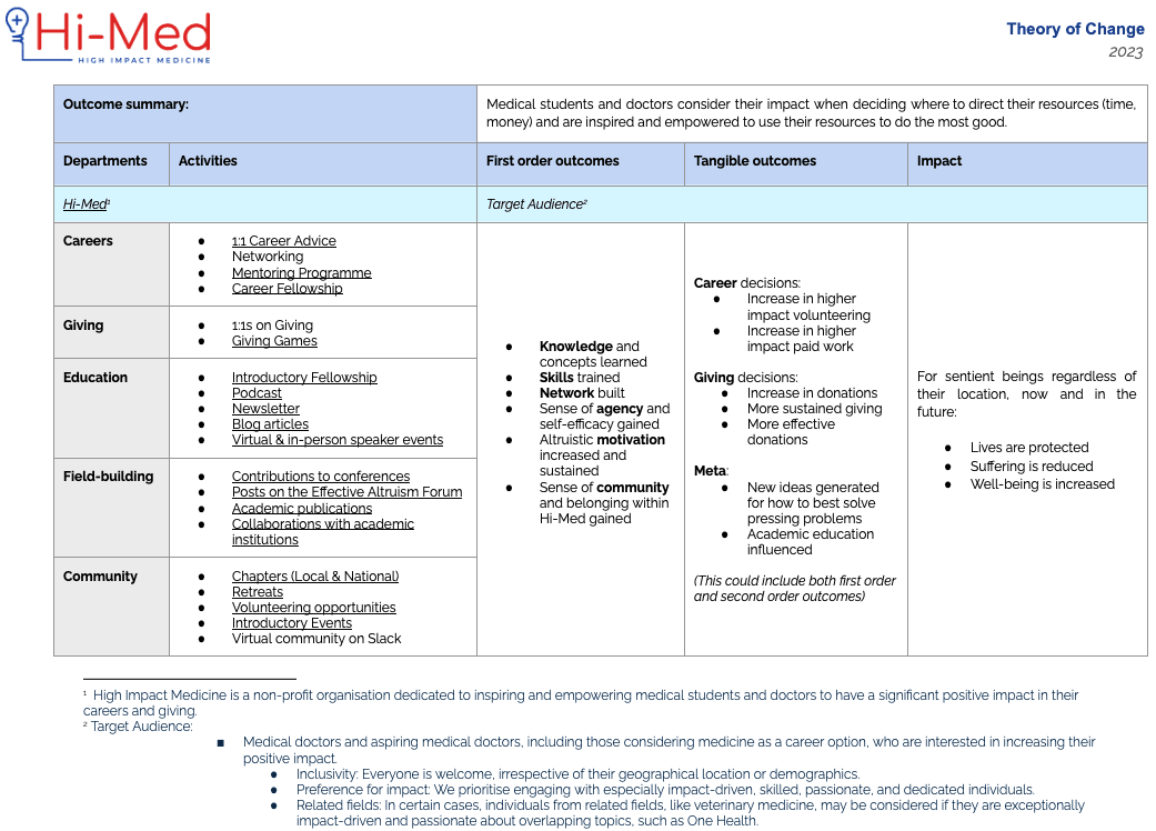 High Impact Medicine (Hi-Med) is a non-profit organisation dedicated to inspiring and empowering medical students and doctors to make impact-driven decisions in their careers and giving.