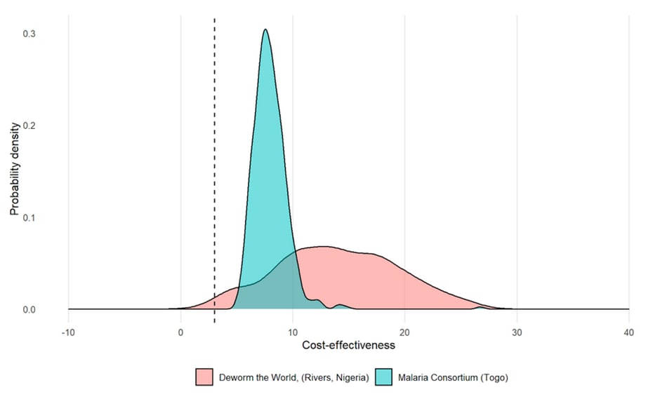 One graph I want to highlight is from the latter essay, which looked at Givewells calculations of cost effectiveness for two different interventions and determined that they did, indeed, have greatly different uncertainty profiles: