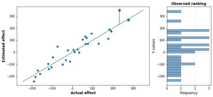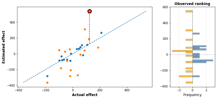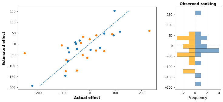 On the left side, each dot is plotted with it’s actual intervention effect on the x-axis, and the estimated effect on the y-axis. The right graph shows what the actual estimator see: a straight ranking of the effectiveness of each intervention.