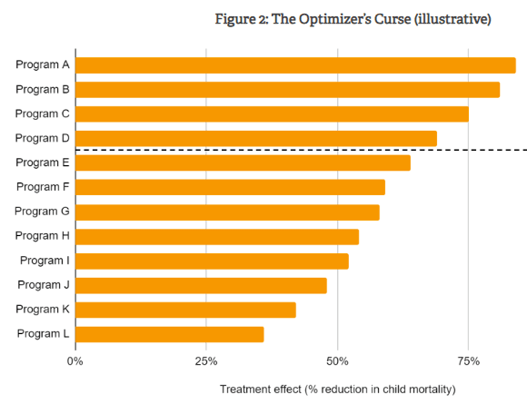 A similar effect is likely to occur here: if you take the top interventions and subject them to increased scrutiny and follow-up studies, you will expect them to drop in estimated effectiveness over time, as errors get spotted and good luck returns to regular luck. If you’re trying to correct for the optimizer's curse, you need to take into account how much of the process has already happened.
