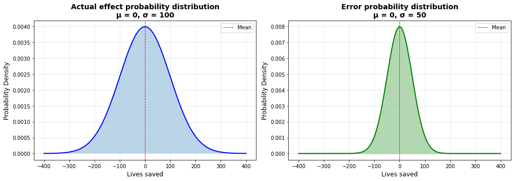 In this model, we will model the actual effect as sampled from a normal distribution, with mean of 0 lives saved and a standard deviation of 100 lives. We then model the error for each intervention as sampled from a different normal distribution, with mean 0 and standard deviation of 50 lives.