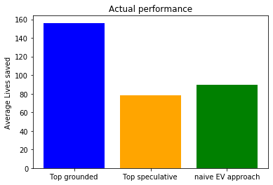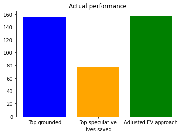 How does this get reflected in the actual performance? In the next set of simulations, I kept track of how many actual lives get saved for three strategies: investing in the top grounded intervention, investing in the top speculative intervention, or investing in whatever the top charity in the evaluation is. Here are the results:
