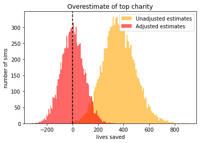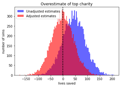 We can see that it basically worked perfectly: with this adjustment we are exactly as likely to overestimate as underestimate the effectiveness of the top charity.