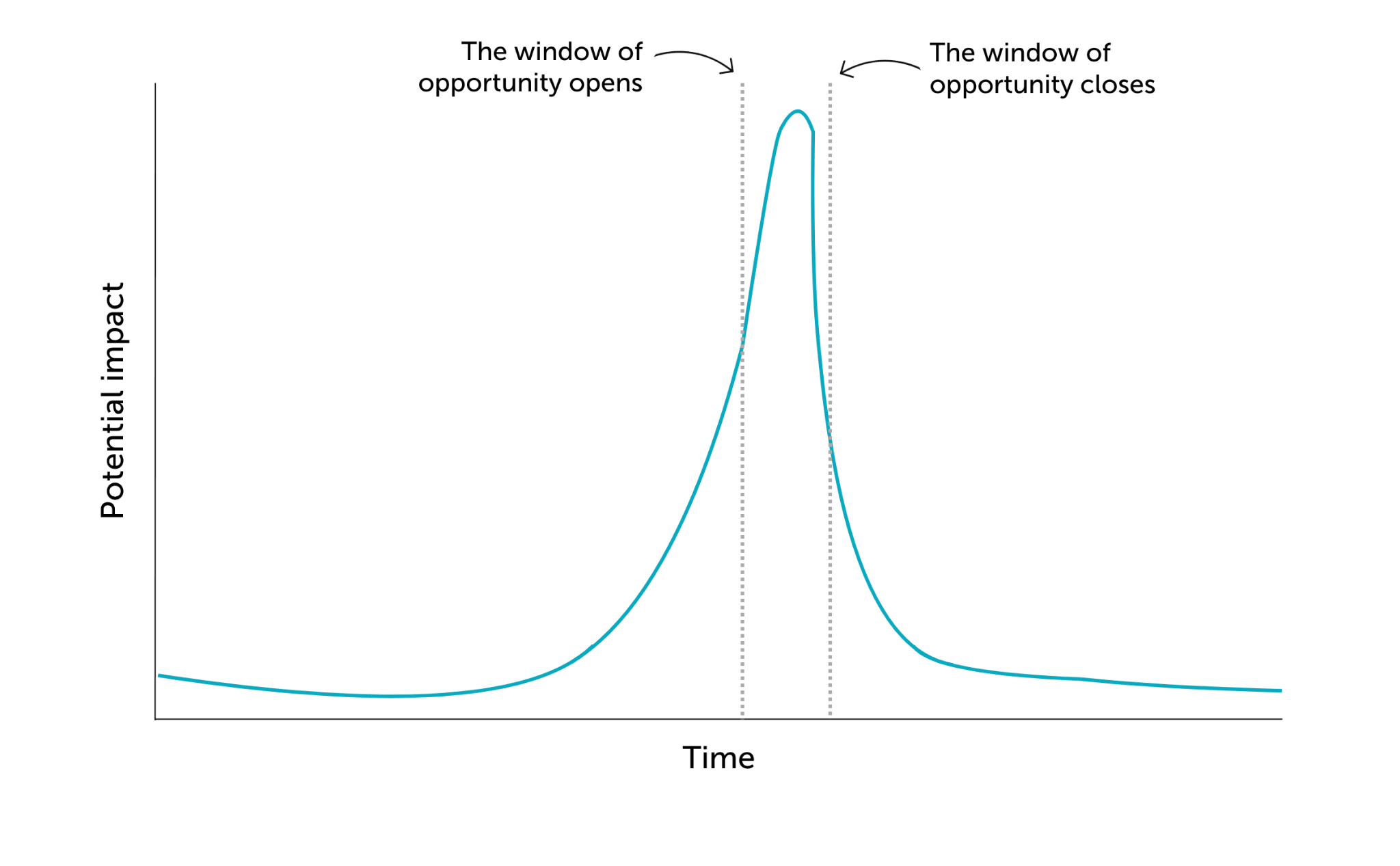 - Build expertise and connections early. By the time an issue is ‘hot,’ you want to have the networks, credibility, and expertise to act quickly.[9] COVID-19, for example, turned long-time biosecurity specialists into go-to advisors trusted with major decisions almost overnight. If you only switch to working on an issue once a window of opportunity opens, you may be too late to make a big impact.