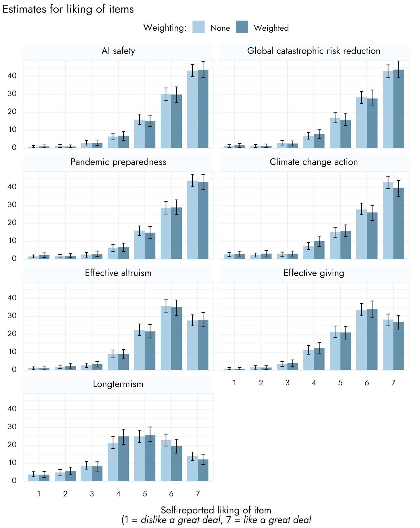 - Specific cause areas like AI safety and pandemic preparedness were generally better liked than broader concepts like EA or longtermism.