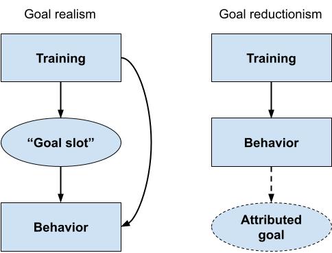 We’ll call the view that goals are explanatorily fundamental, “goal realism.” On the opposing view, which we’ll call goal reductionism, goal-talk is just a way of categorizing certain patterns of behavior. There is no true underlying goal that an AI has— rather, the AI simply learns a bunch of contextually-activated heuristics, and humans may or may not decide to interpret the AI as having a goal that compactly explains its behavior. If the AI becomes self-aware, it might even attribute goals to itself— but either way, the behaviors come first, and goal-attribution happens later.
