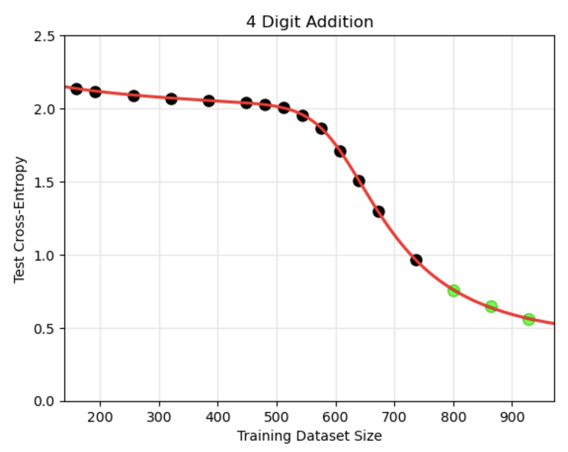 Let’s see what the overfitting argument predicts in a simple real-world example from Caballero et al. (2022), where a neural network is trained to solve 4-digit addition problems. There are 10,0002 = 100,000,000 possible pairs of input numbers, and 19,999 possible sums, for a total of 19,999100,000,000 ≈ 1.10 ⨉ 10430,100,828 possible input-output mappings.[2] They used a training dataset of 992 problems, so there are therefore 19,999100,000,000 – 992 ≈ 2.75 ⨉ 10430,096,561 functions that achieve perfect training accuracy, and the proportion with greater than 50% test accuracy is literally too small to compute using standard high-precision math tools.[3] Hence, this argument predicts virtually all networks trained on this problem should massively overfit— contradicting the empirical result that networks do generalize to the test set.