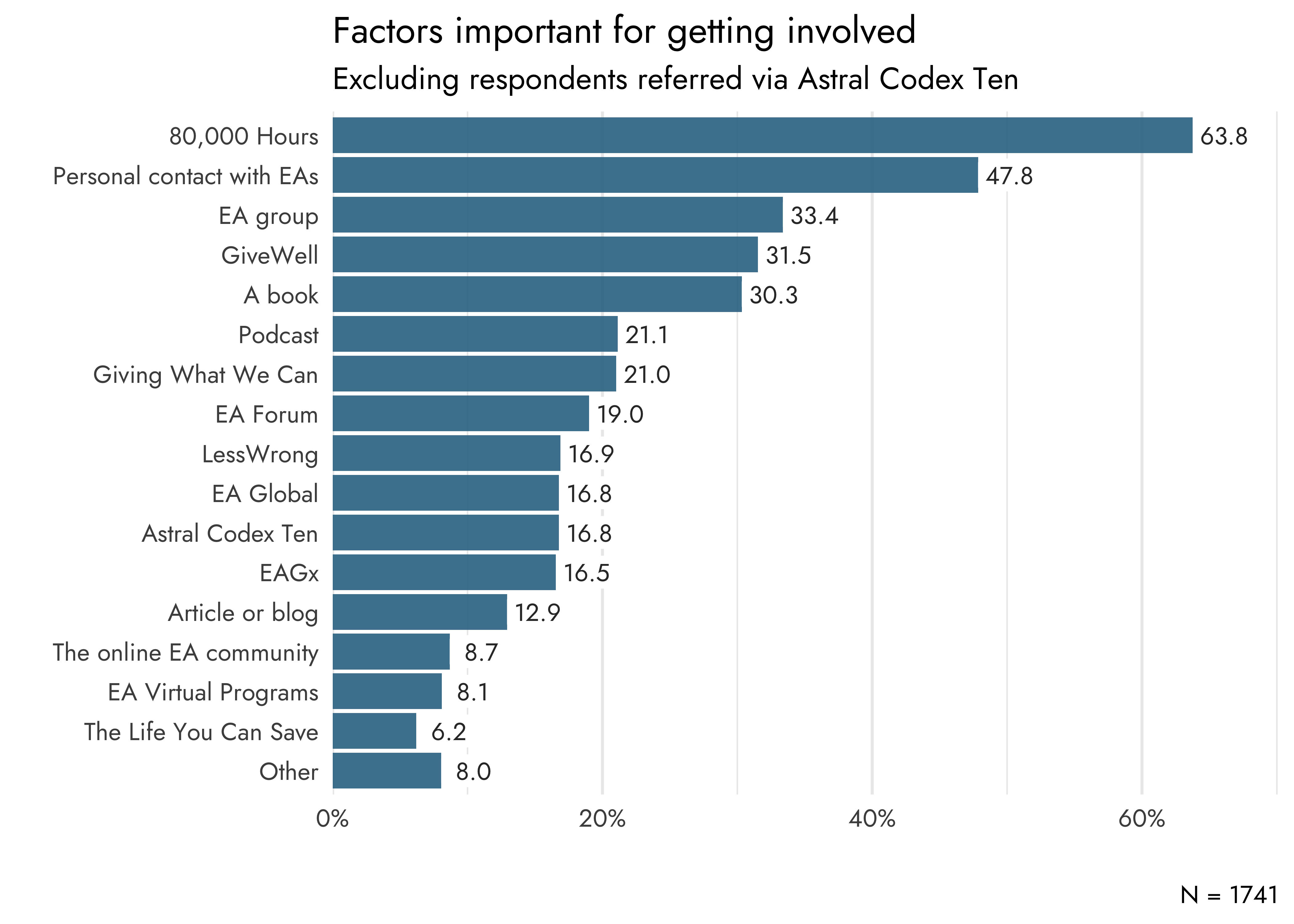 We also performed a robustness check excluding respondents referred to the survey from Astral Codex Ten, since it was the third most popular referral source (14.6%), after 80,000 Hours (18.5%), and being emailed the survey directly (29.4%). Excluding these respondents reduced the percentage of respondents who first heard of EA via Astral Codex Ten from 8.4% to 4.6%, a decrease similar in absolute size to the one observed when excluding respondents from 80,000 Hours. The percentage of respondents selecting Astral Codex Ten as important for getting involved decreased from 25.4% to 16.8%, which is a more sizable decrease compared to the decrease in 80,000 Hours after excluding respondents referred from 80,000 Hours. Excluding respondents from Astral Codex Ten also has a larger impact on sources other than Astral Codex Ten, as seen with for example GiveWell (going from 34.2% to 31.5%) and EA groups (going from 30.6% to 33.4%). The overall ranking, however, remains largely similar, with only minor changes.
