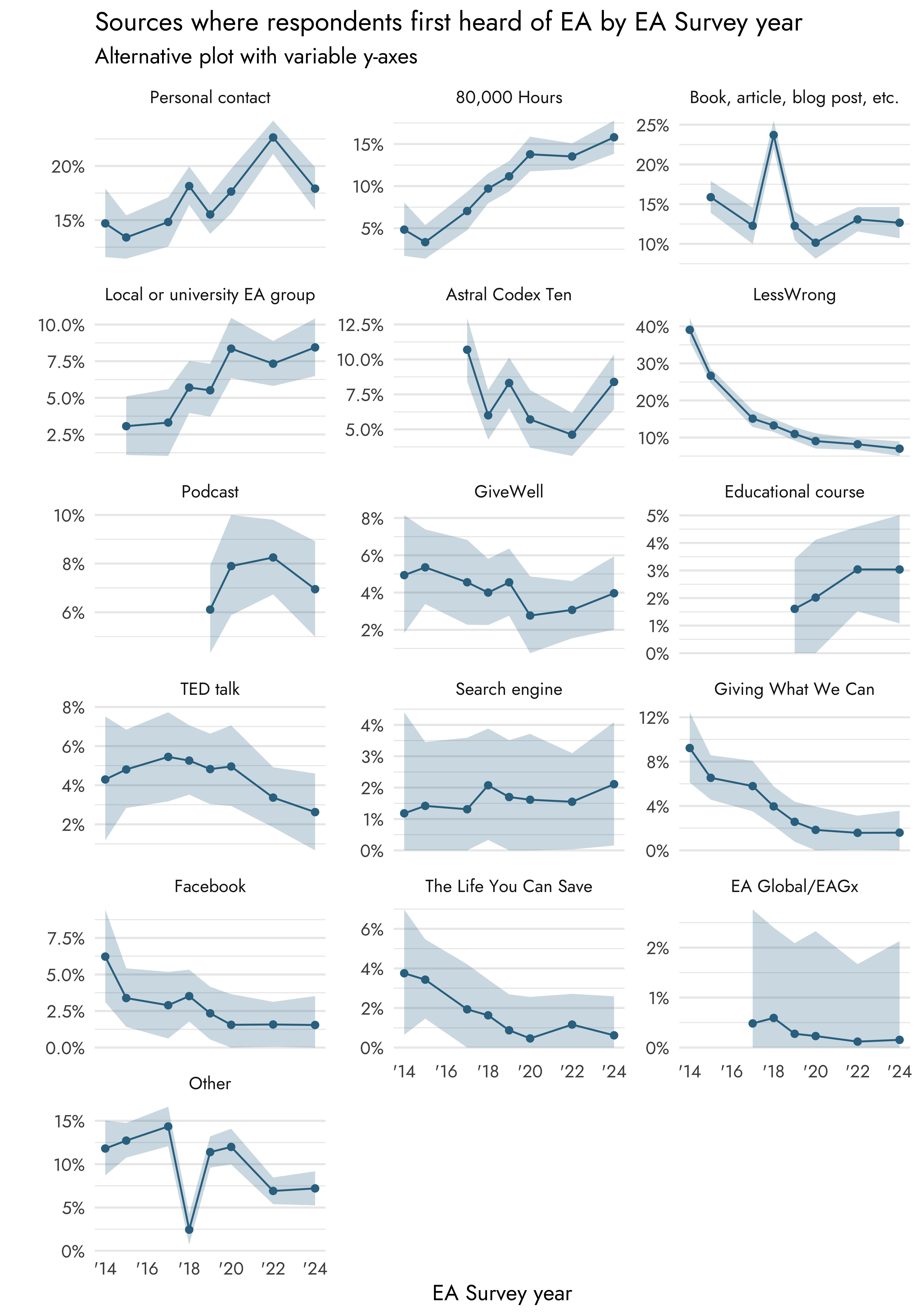 Local or university EA groups have also become more important since 2015, from 3% to ~8%, although it has not become more or less popular in recent years. We also saw a relative growth for several years in personal contacts (from ~15% to ~22%), although we see a relative decrease between 2022 and 2024 (to 17.9%).
