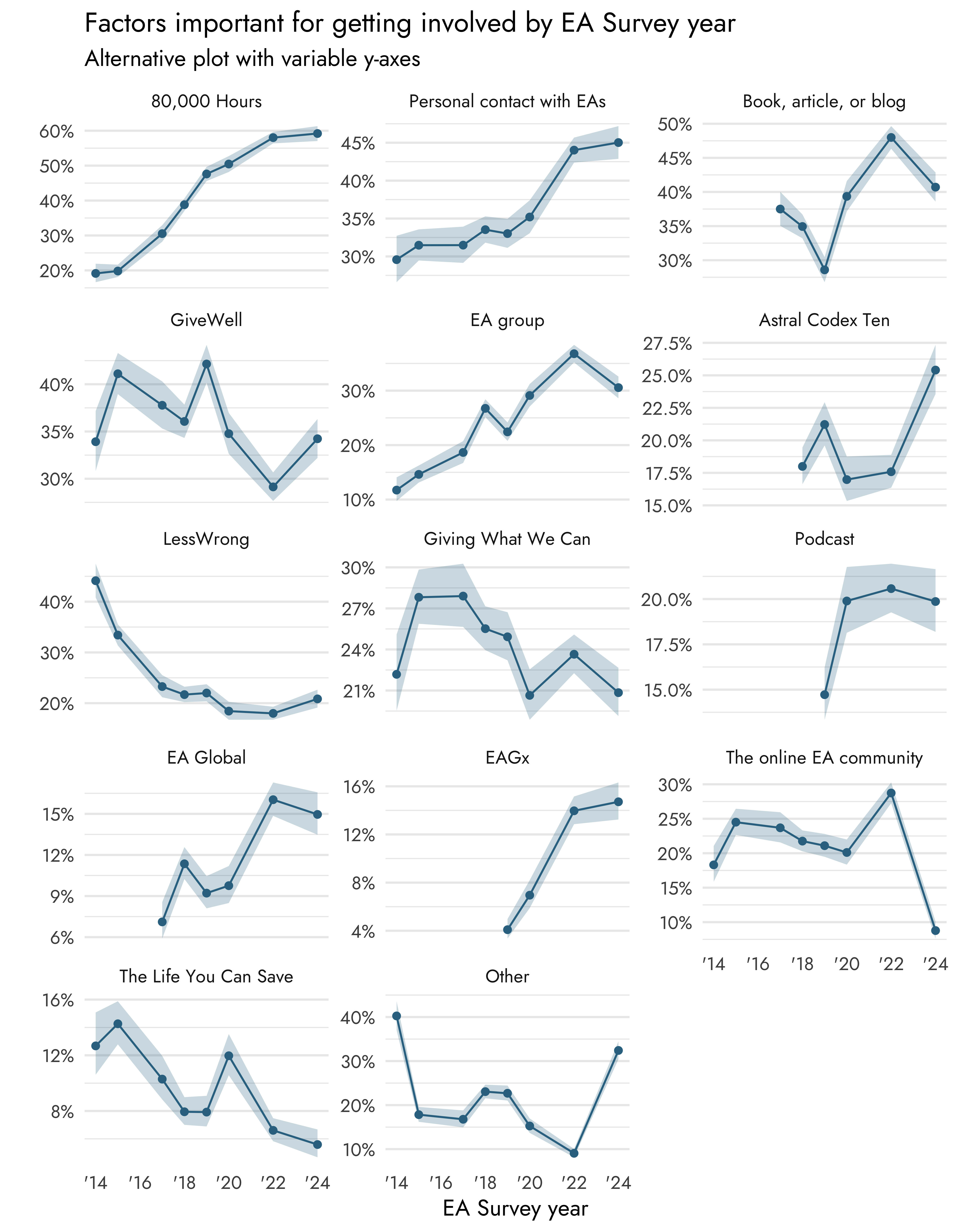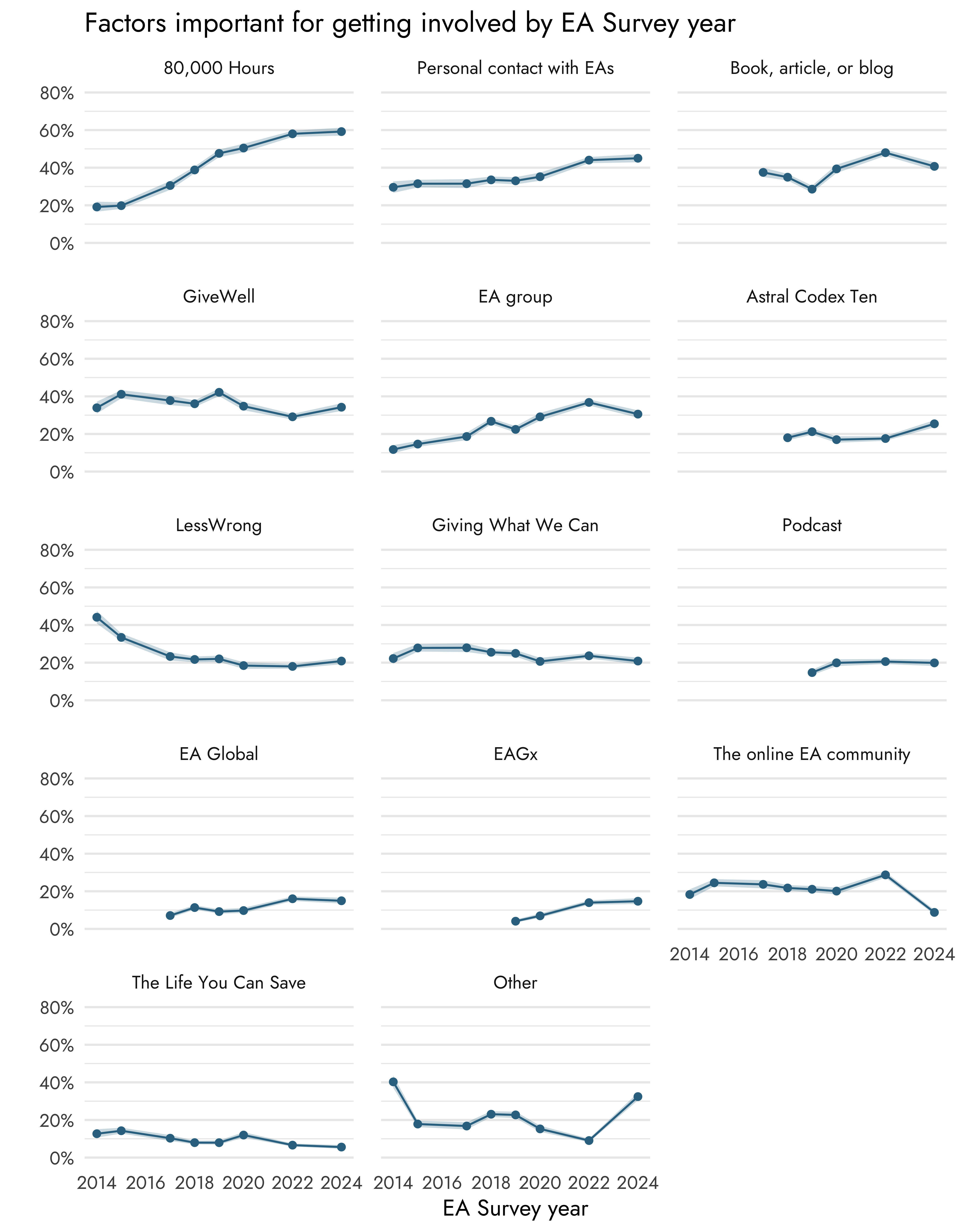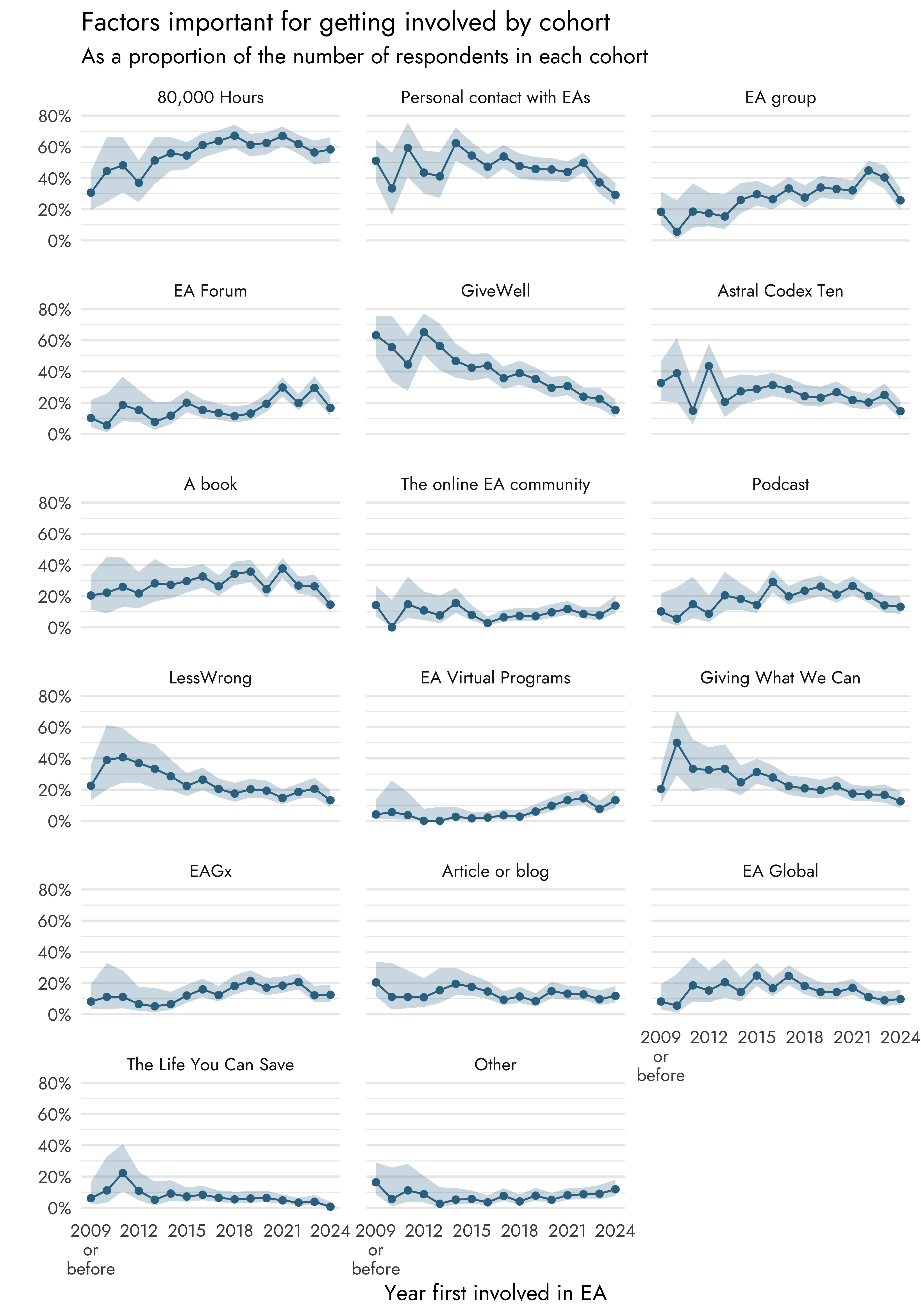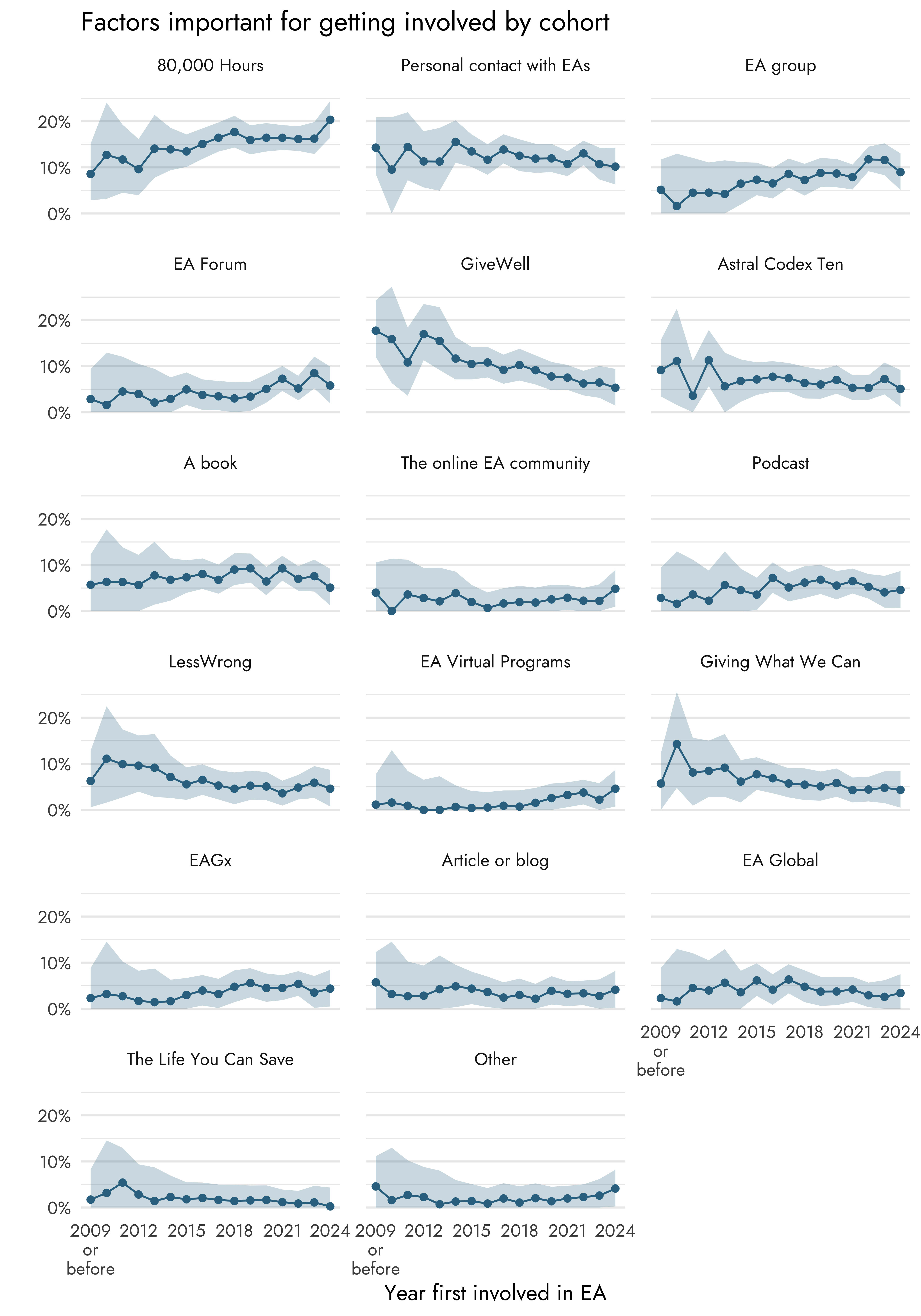 Just like we observed last time, we see fewer cohort effects for factors important for getting involved. We do again see that 80,000 Hours is more important for getting involved among recent cohorts compared to older cohorts, with ~15% of respondents in the more recent cohorts selecting 80,000 Hours and ~10% in the older cohorts. To a lesser extent, we also see that the EA Forum and EA groups are seen as more important among recent cohorts compared to older cohorts, although it should be noted that the confidence intervals for the oldest cohorts are wide due to the low sample sizes in those cohorts.