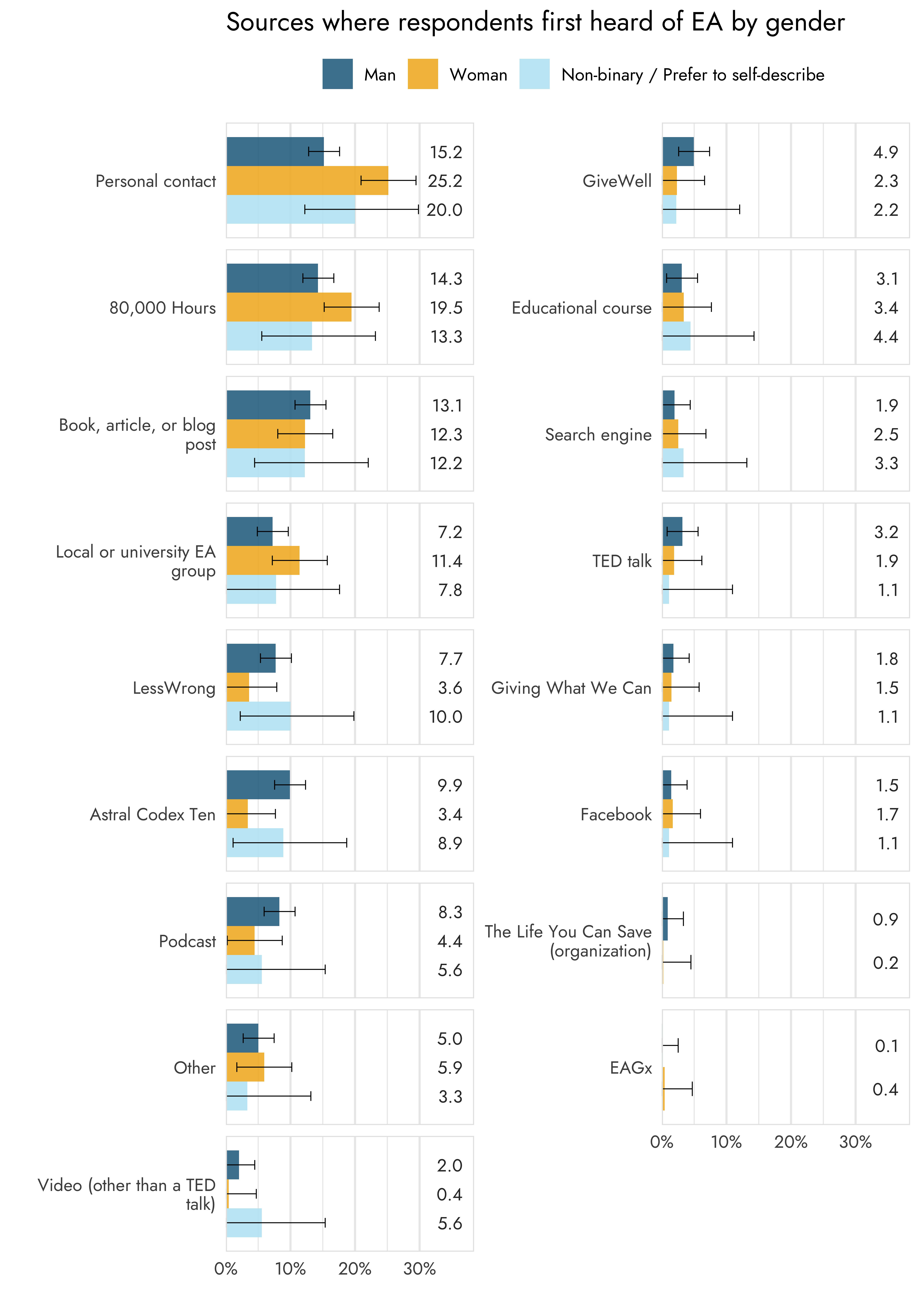 In terms of gender differences, we see that women are more likely to report that they first heard of EA via a personal contact (25.5% vs. 15.2%), 80,000 Hours (19.5% vs. 14.3%), and a local or university EA group (11.4% vs. 7.2%) compared to men. Men, on the other hand, are more likely to report having first heard of EA via Astral Codex Ten (9.9% vs. 3.4%), LessWrong (7.7% vs. 3.6%), a podcast (8.3% vs. 4.4%), GiveWell (4.9% vs. 2.3%), and a video (other than a TED talk; 2% vs. 0.4%). Of these, the largest difference is that for personal contact, followed by Astral Codex Ten and 80,000 Hours.