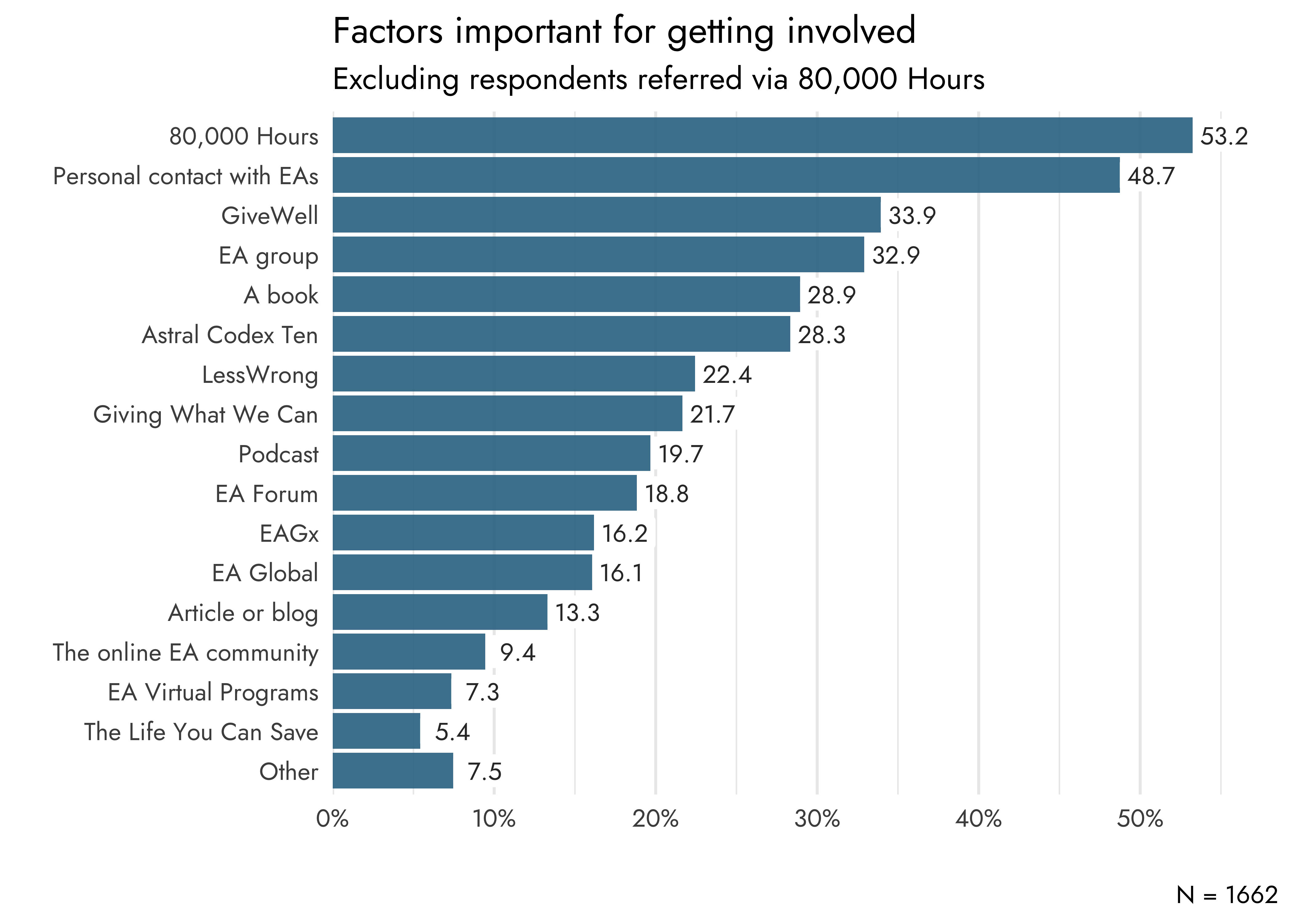 - 80,000 Hours and personal contacts were also the factors most commonly cited as important for helping respondents get involved in EA, in roughly similar proportions as in 2022