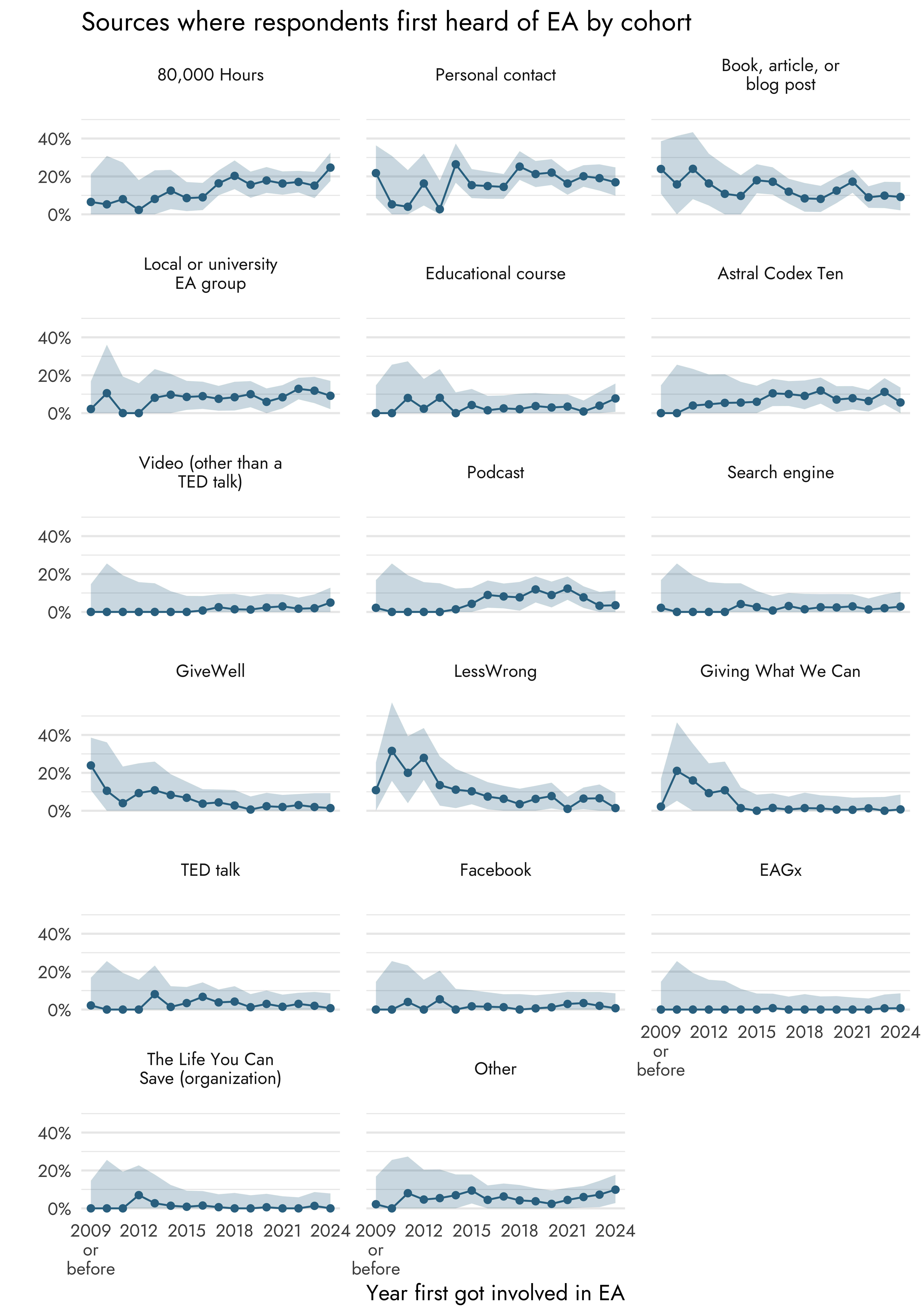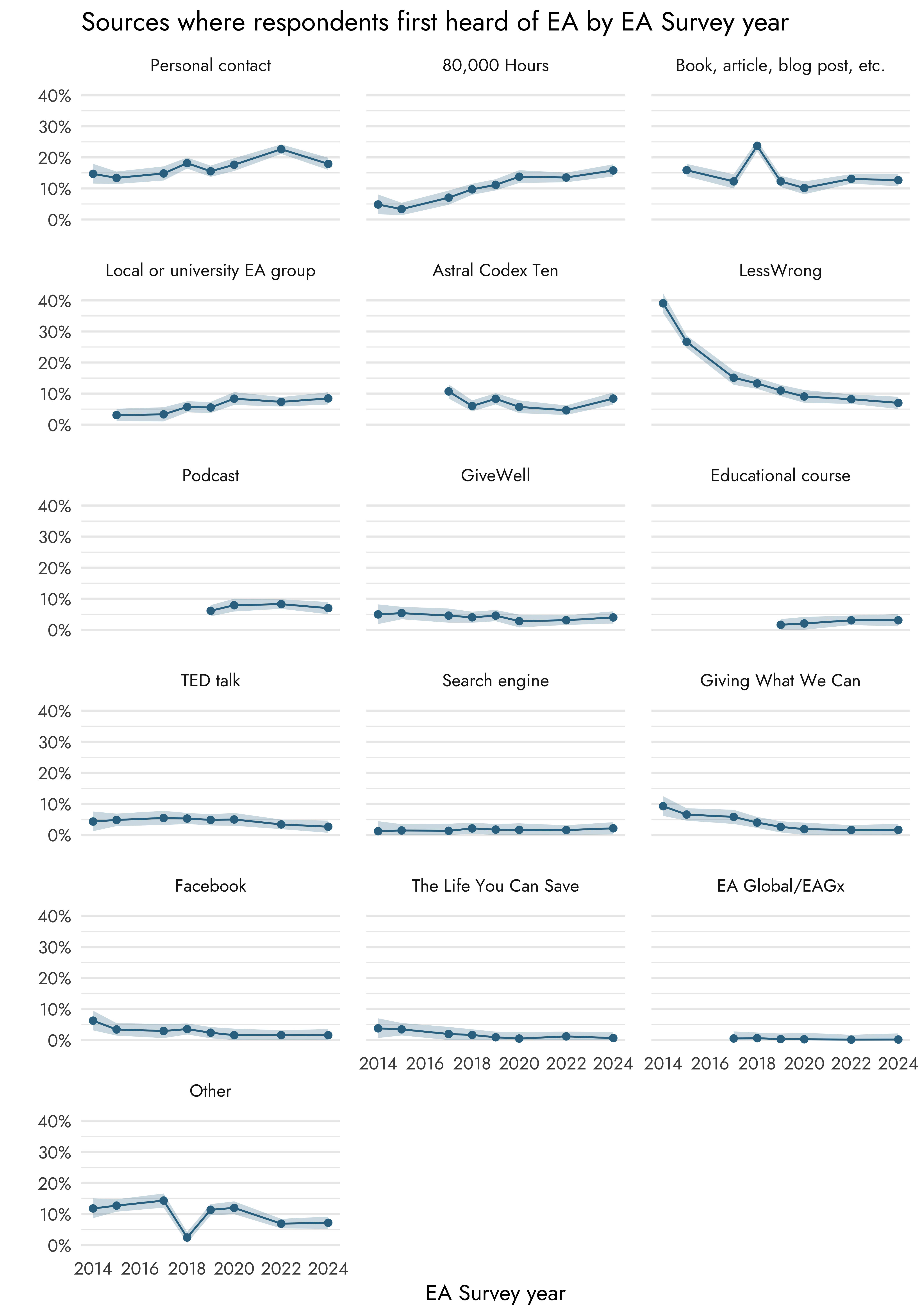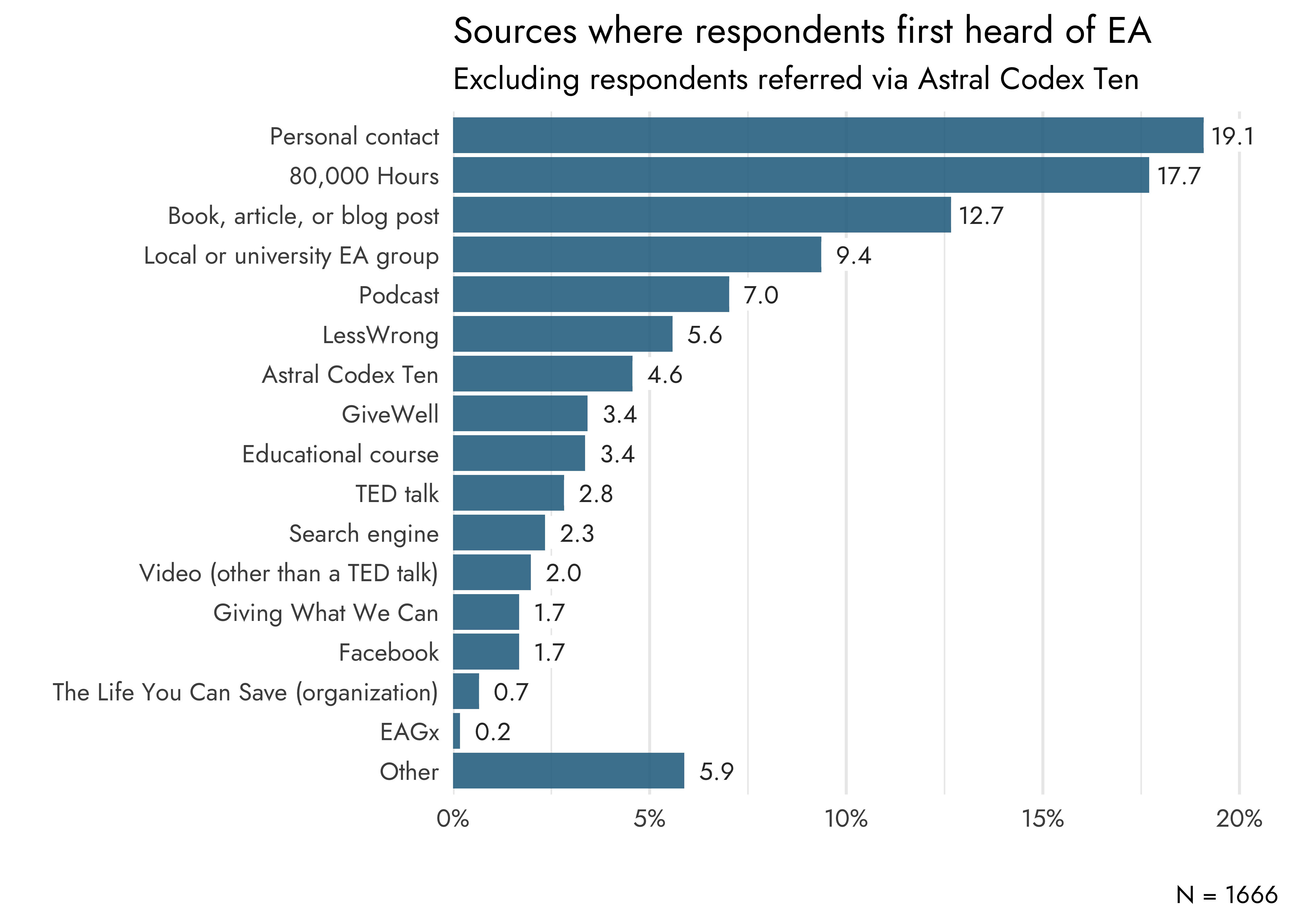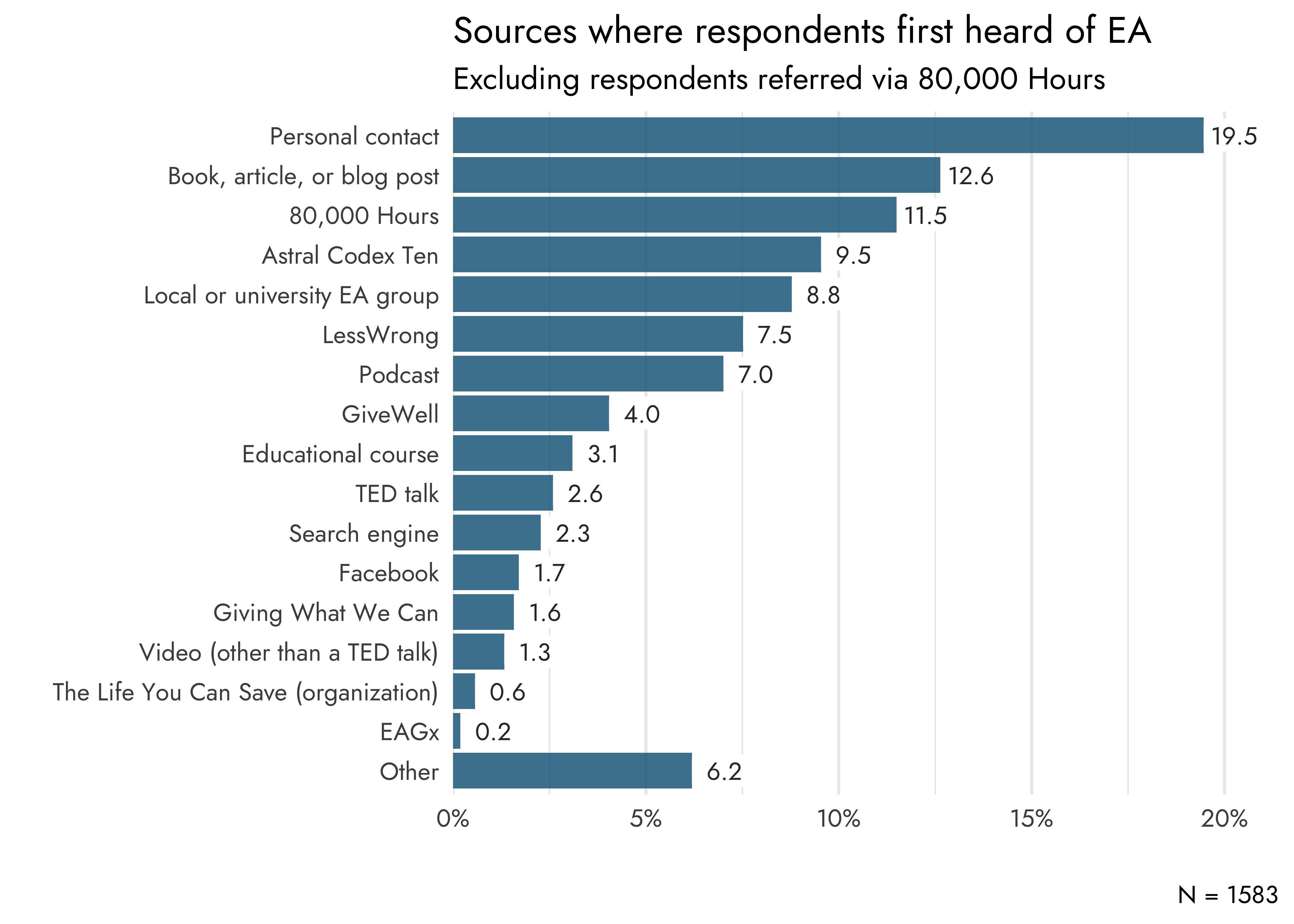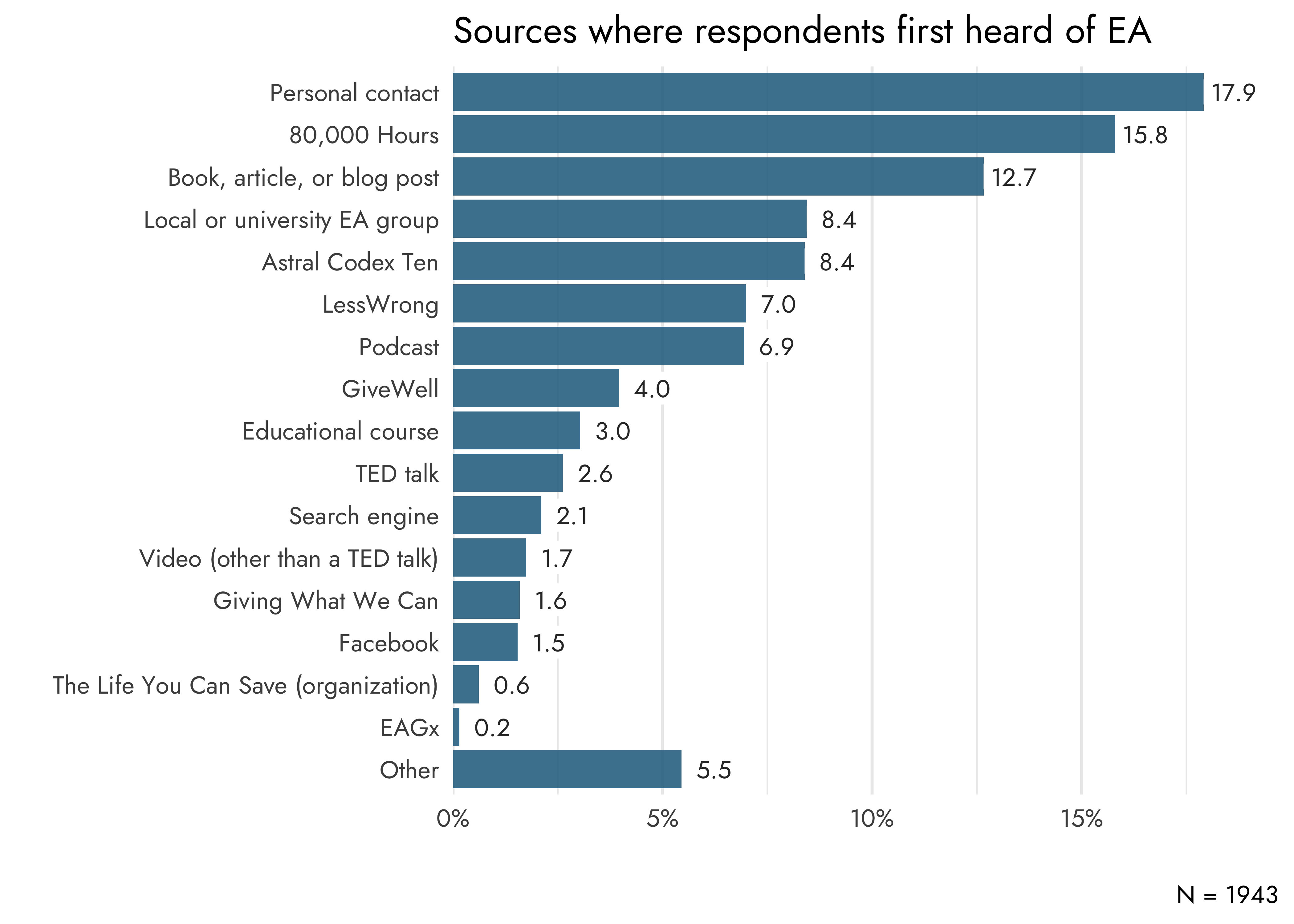 - Personal contacts (17.9%) and 80,000 Hours (15.8%) remain the largest sources of people first hearing about EA