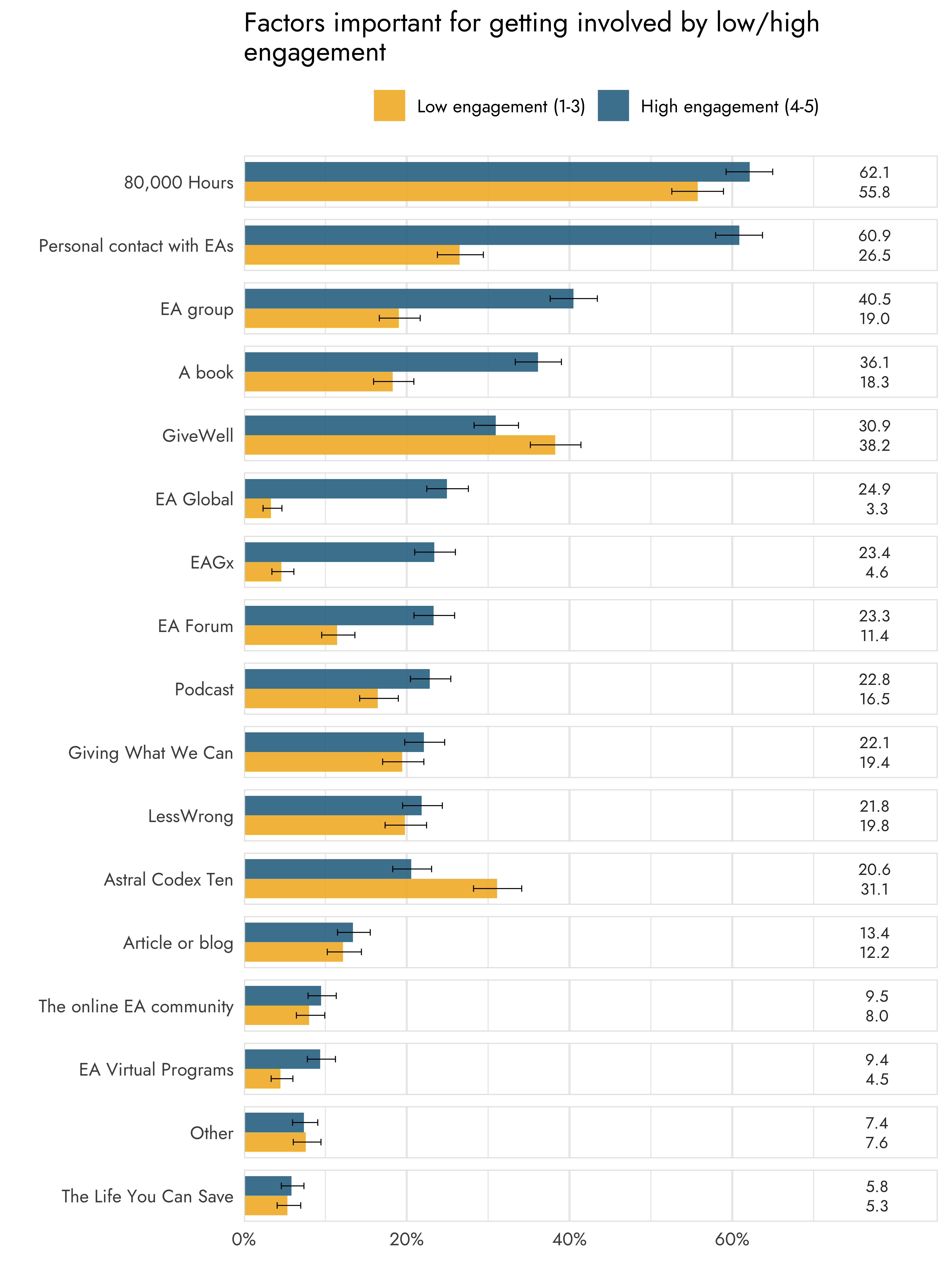 In addition to asking about where respondents first heard of EA, we also asked them which of several factors have been important for them getting involved in EA, such as 80,000 Hours, a book, or the EA Forum. They were asked to select all that apply, so they could select more than one factor.