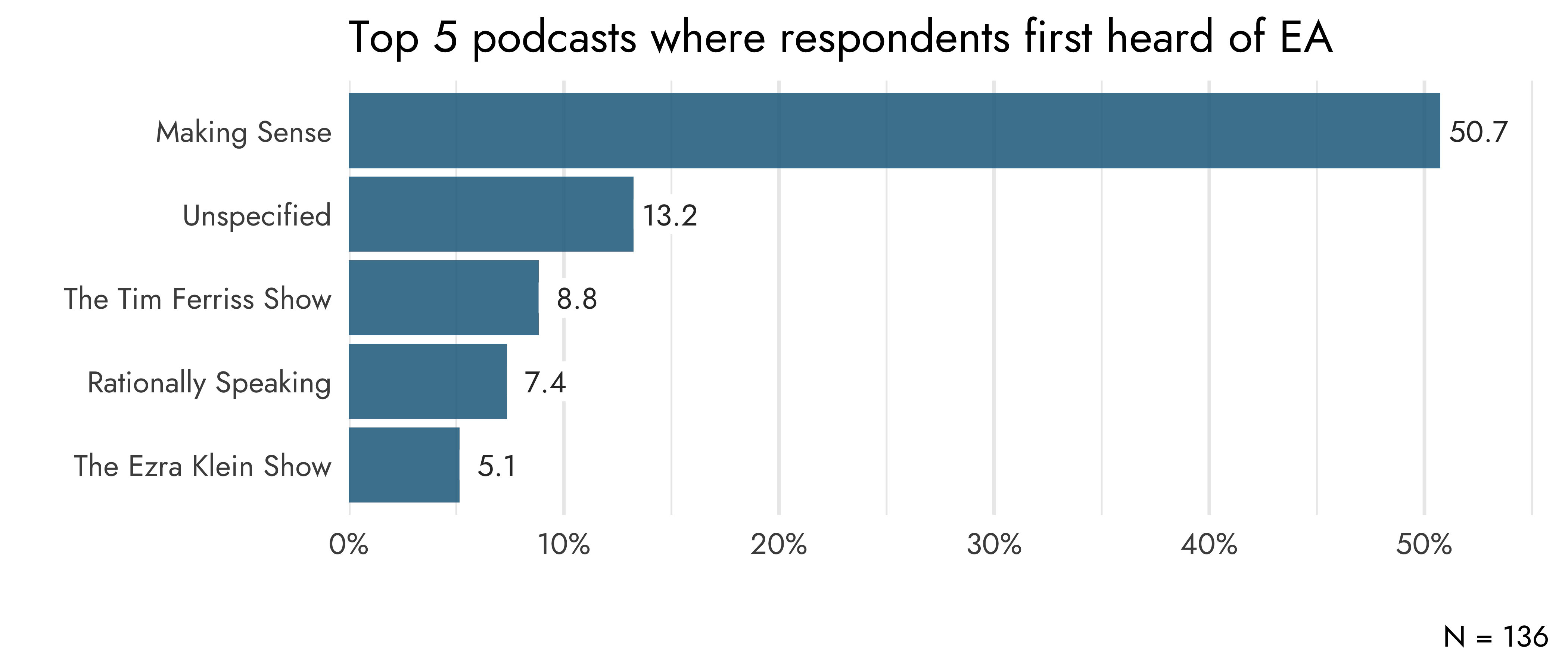 A total of 136 respondents said they first heard of EA via a podcast. By far, the most frequently mentioned podcast was Making Sense by Sam Harris (50.7%), followed by respondents not mentioning the exact podcast (‘Unspecified’; 13.2%). These were followed by The Tim Ferriss Show (8.8%), Rationally Speaking (7.4%), and the Ezra Klein Show (5.1%).