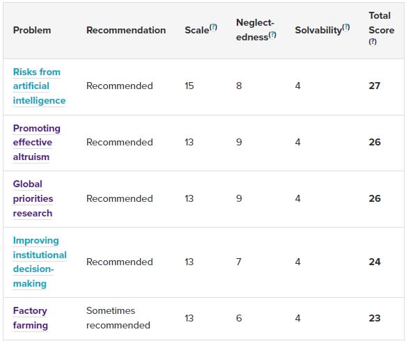 80000 hours has lots of concrete guides of each cause areas for us to work in, and there's even an estimate the importance of each problem(though they claim it's not very accurate) as below. But they uses x-risks angle to estimate. Like the"Scale" number is determined by the people we save(DALYs), so AI safety got the highest score because its extinction risk is the highest. But in s-risks, the main point should be "the suffering we reduce". There are also lots of areas in s-risks, are there any cause priortization researches on s-risks?