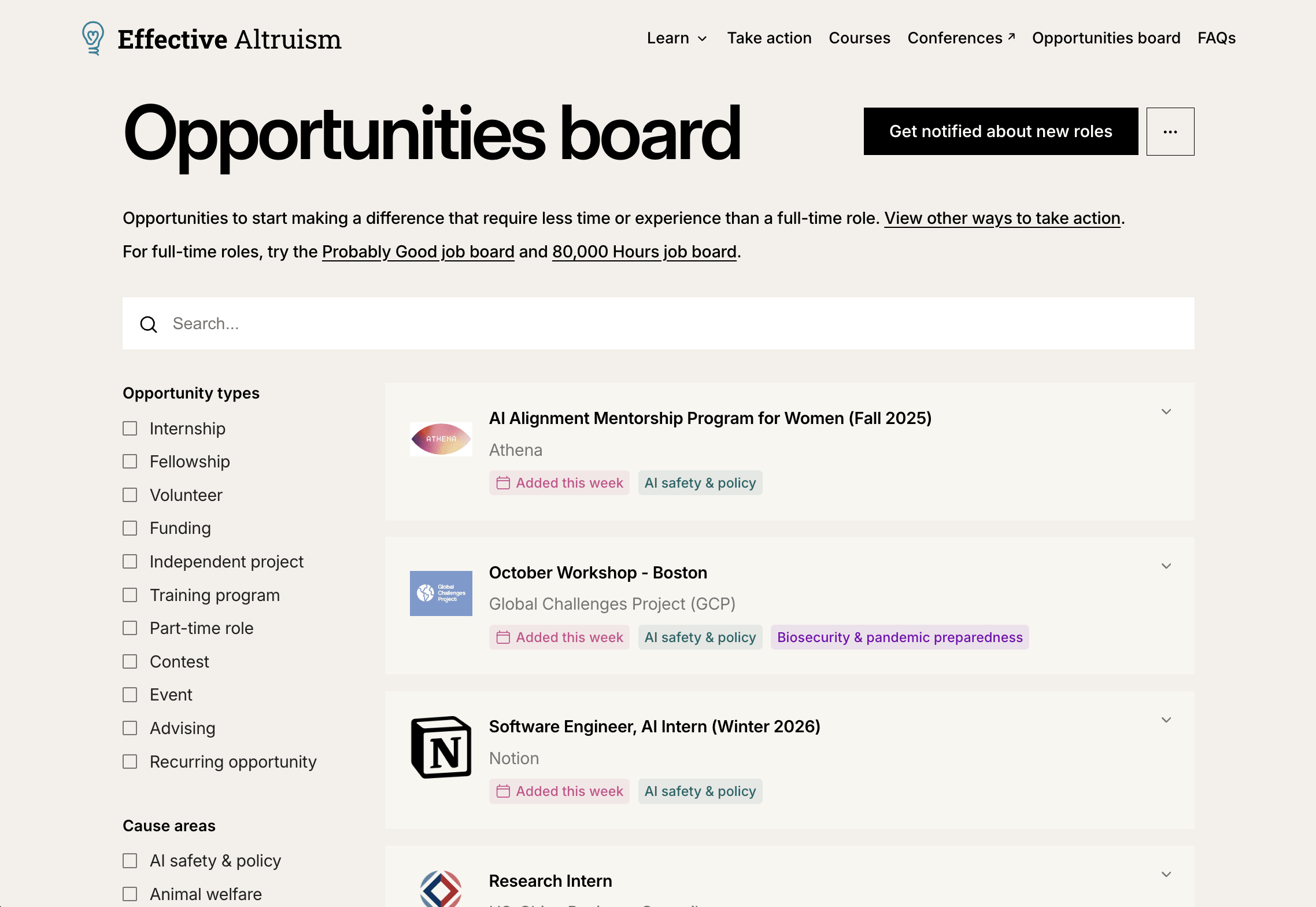 The EA Opportunities Board is a website that lists accessible opportunities for building skills or contributing to impactful work. It includes things like internships, volunteer opportunities, part-time roles, training programs, funding opportunities — anything short of a full-time role.
