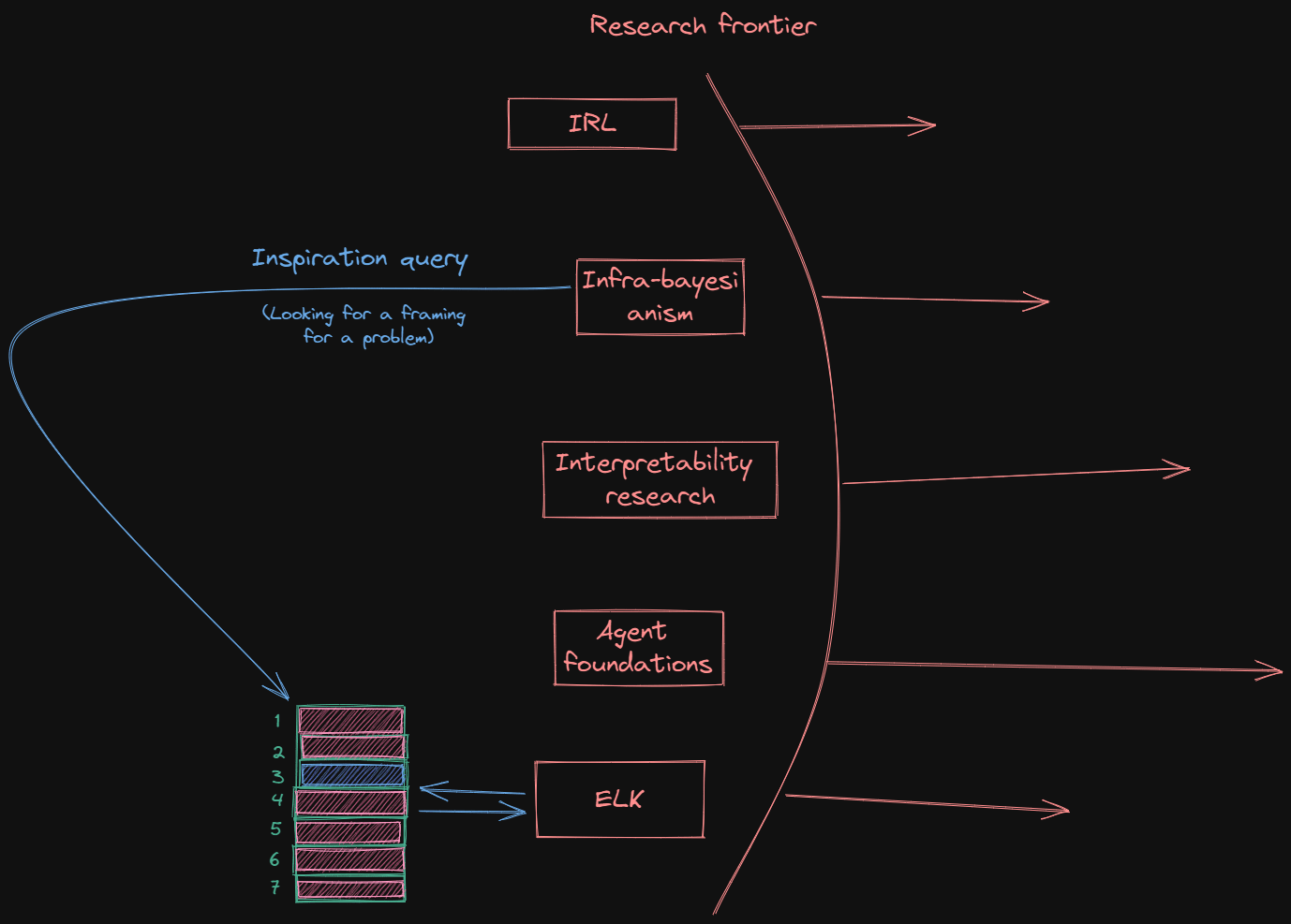 For example, if we're working on infrabayesianism and trying to solve a complicated problem regarding ontology verification (not sure if this is an actual thing being worked on in infrabayesianism). We then try to take inspiration from ELK, as it has been worked on a lot in the reference class of ontologies. This might look something like this: