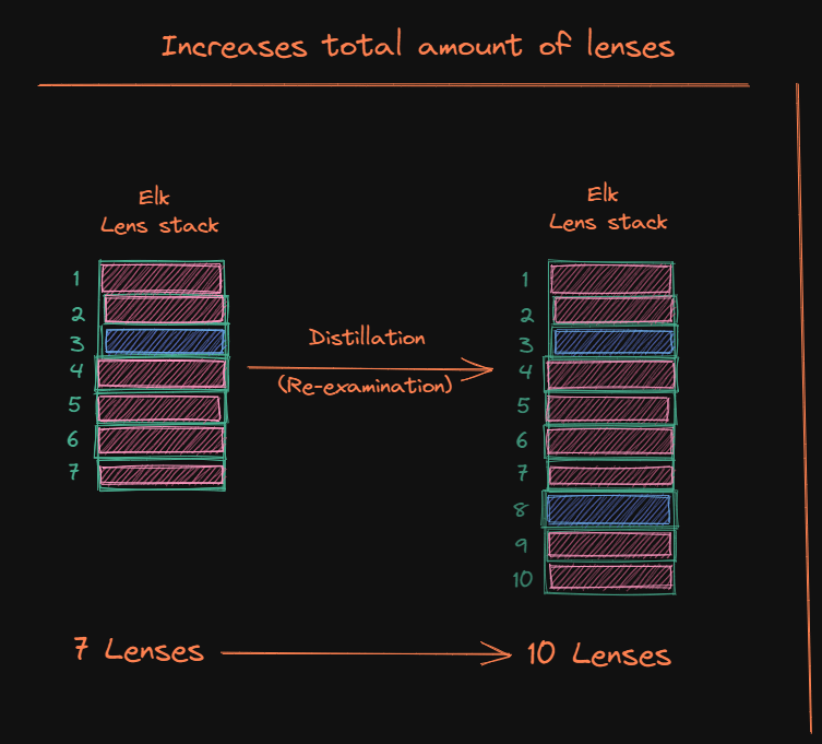 ELK has a research stack of 7 different perspectives in our fictional example. The red blocks are perspectives that don’t yield any light on the problem, whilst the blue lens helps with progress on the problem. A visualization of this is the following: