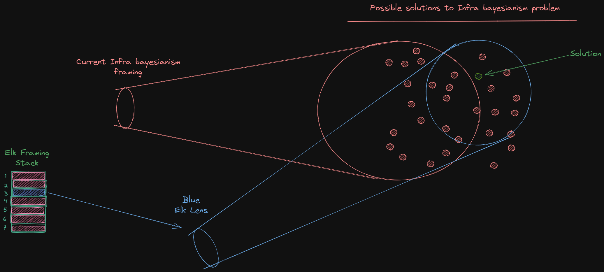 Here we can see the old perspective in orange, the old framing of the problem. In our fictional example, the current orange infrabayesian frame might sound something like “This is a one-to-many problem where we have to apply causal inference to back-chain, to formalise this we use causal scrubbing with Knightian uncertainty”