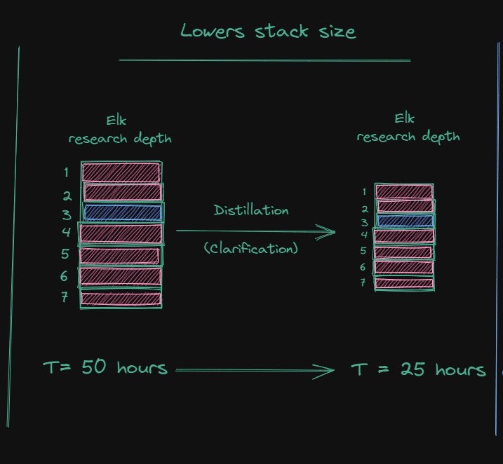 Through the process of summarisation and clarification, distillation lowers the stack size or the research depth of an area:
