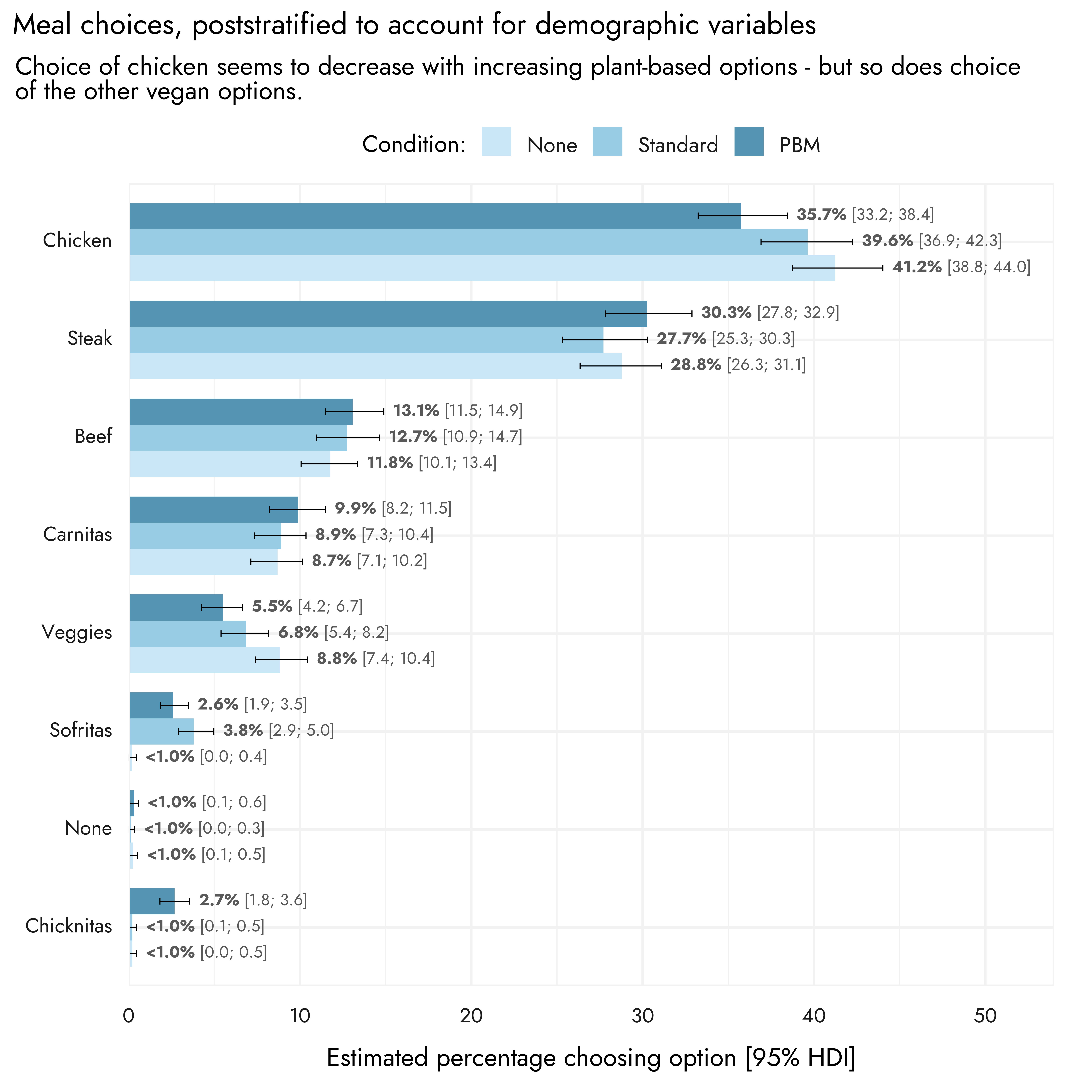 Making an additional plant-based option available did not meaningfully change meal selections. This held for both a long-standing PMA option (Sofritas) and a novel one (Chickānitas). Reducing meat consumption is a hard problem, and achieving price-, taste-, and convenience- parity wonāt obviously do the trick either.