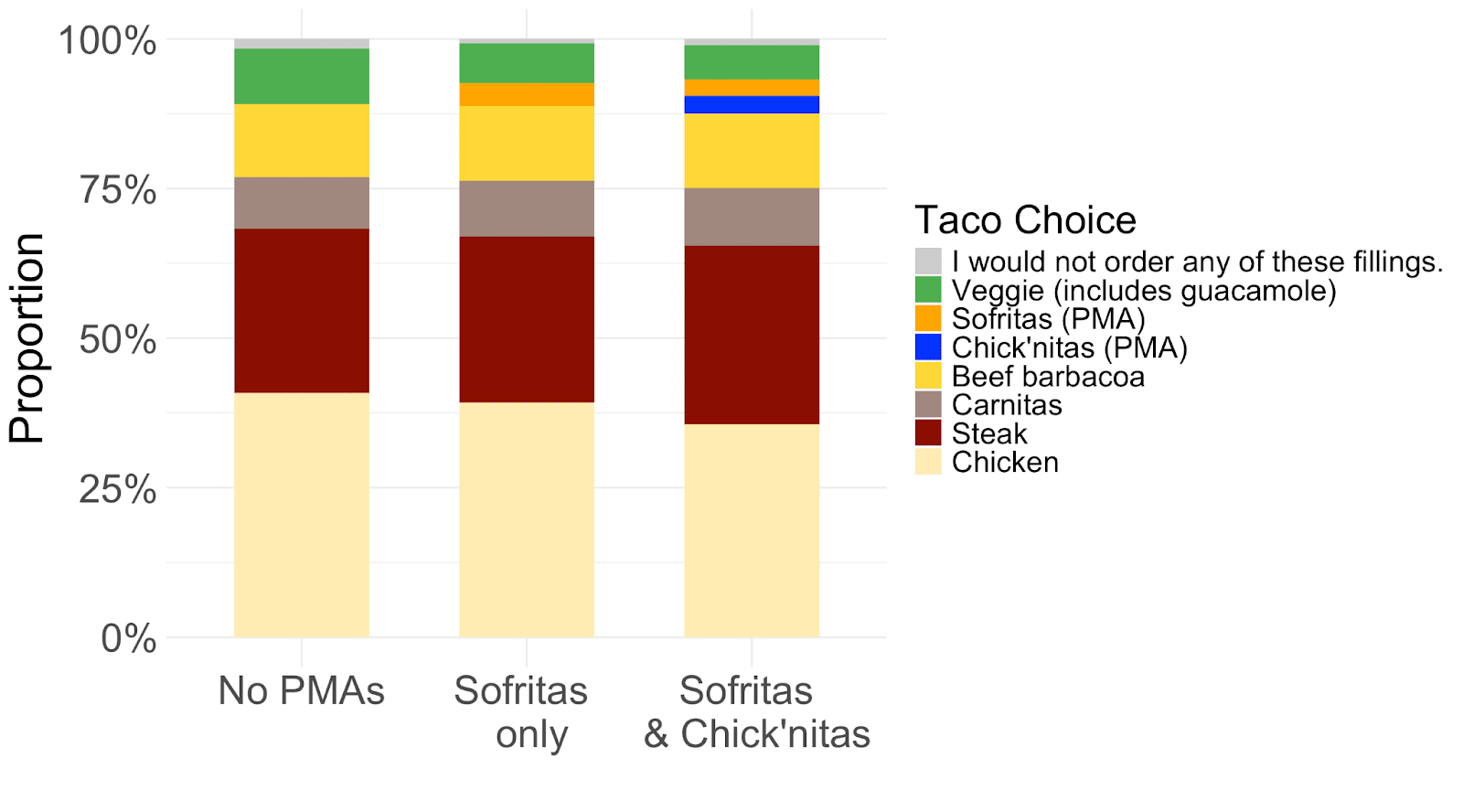 The main outcome was whether people chose a meat-based taco filling or not. Our second outcome was whether Chickānitas reduced demand for chicken specifically among meat-based options. All outcomes were hypothetical, and price was held constant.