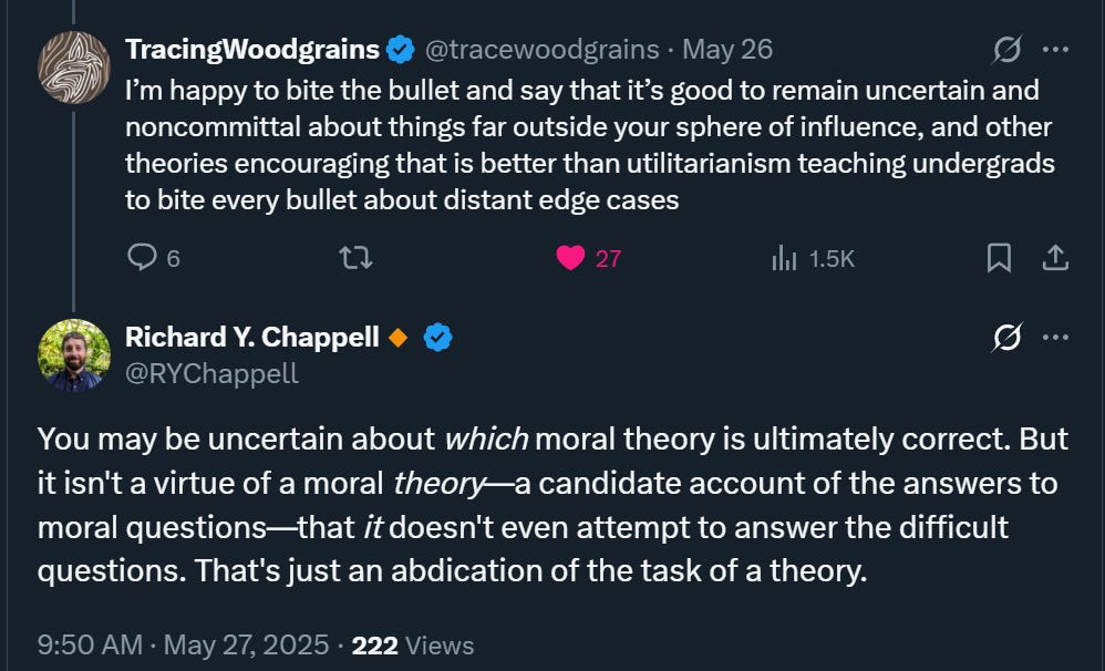 TracingWoodgrains recently offered the interesting response that âitâs good to remain uncertain and noncommittal,â and so âother theories encouraging that is better than utilitarianism teaching undergrads to bite every bulletâŚâ