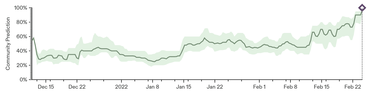 By contrast, by the time 100 forecasters had given their input, on December 15, the community prediction was 34%. On January 28, the community prediction was 45%. On February 11, the community prediction climbed to 70% overnight. The invasion happened on February 24th.