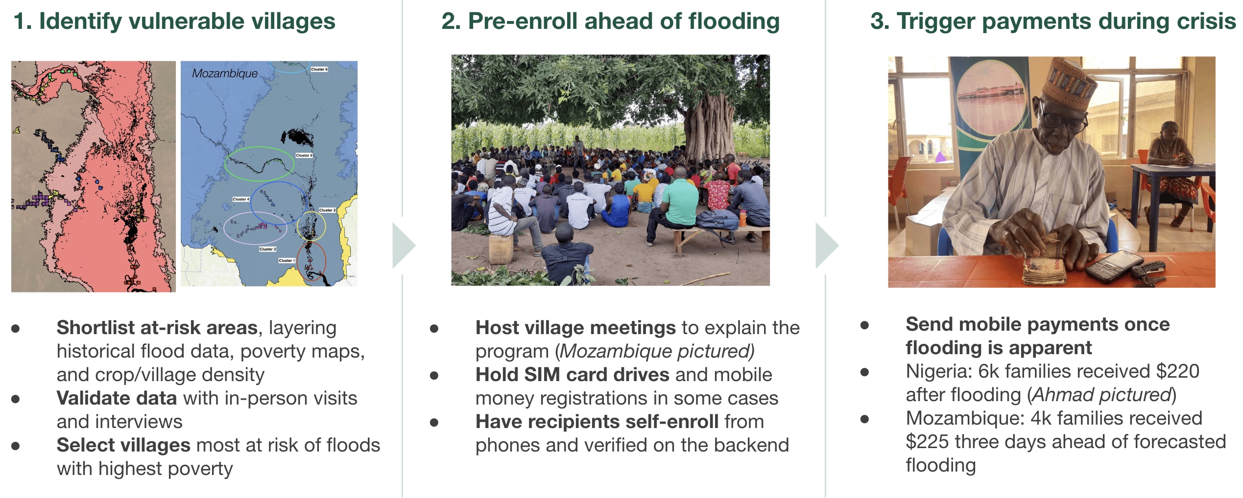 Over 1.5B people in low and middle income countries are threatened by extreme floods. Evidence shows giving them unconditional cash during a crisis lets them meet their immediate needs and rebuild their lives. However, operating in countries with limited infrastructure during severe weather events is complicated, so we ran two pilots to test and learn (see Appendix):