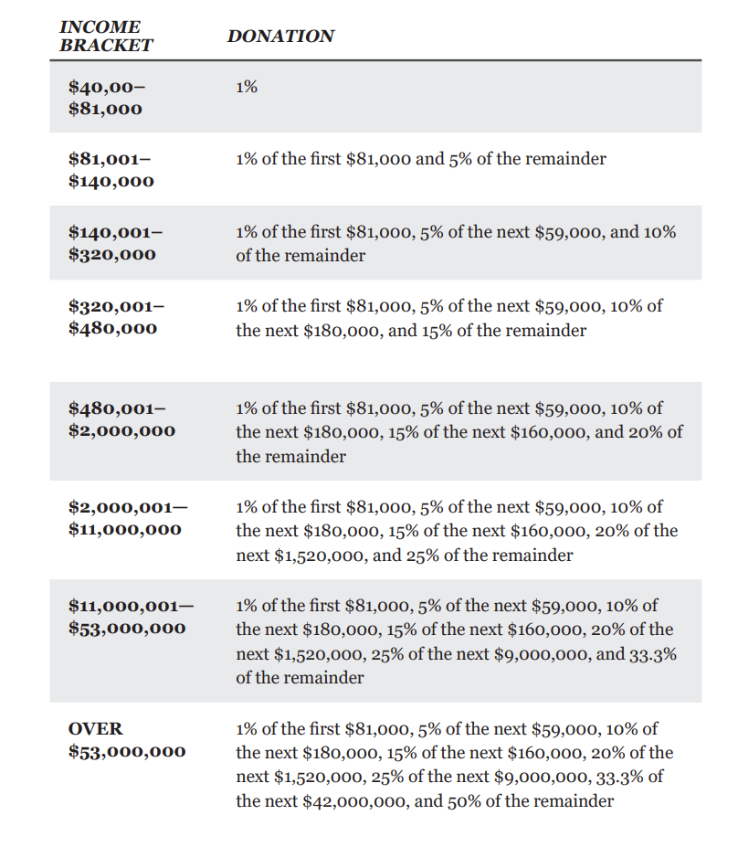 - 40 to 80 k$/year, they “recommend” annual donations equal to 1 % of the annual pre-tax income.