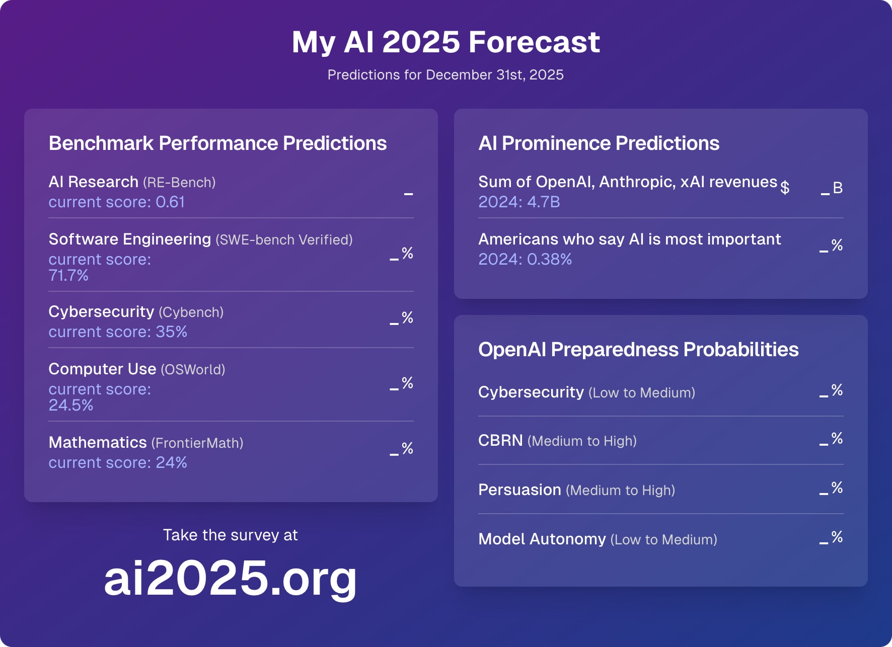 Until this Sunday, you can submit your 2025 AI predictions at ai2025.org. It’s a forecasting survey by AI Digest for the 2025 performance on various AI benchmarks, as well as revenue and public attention.